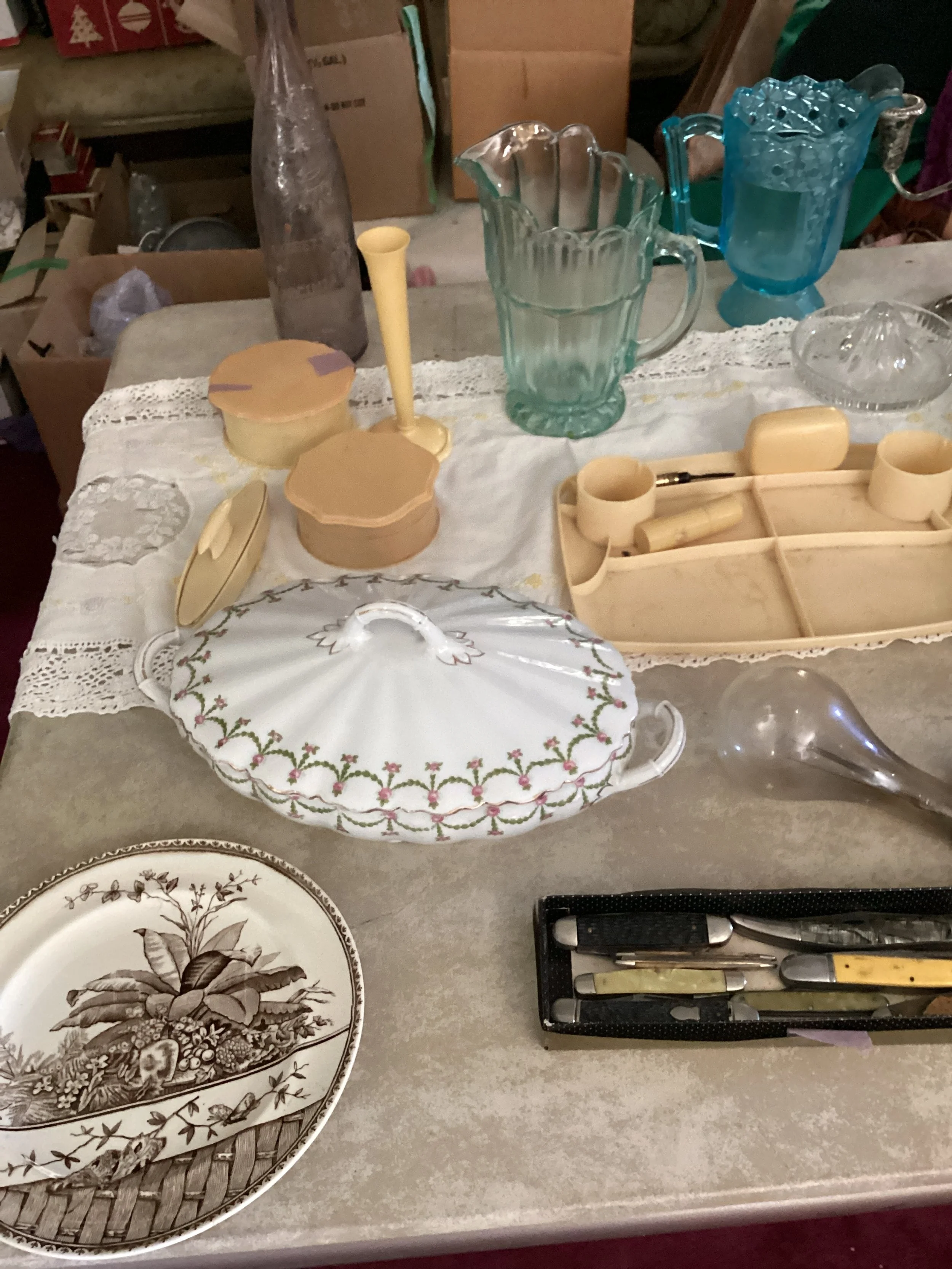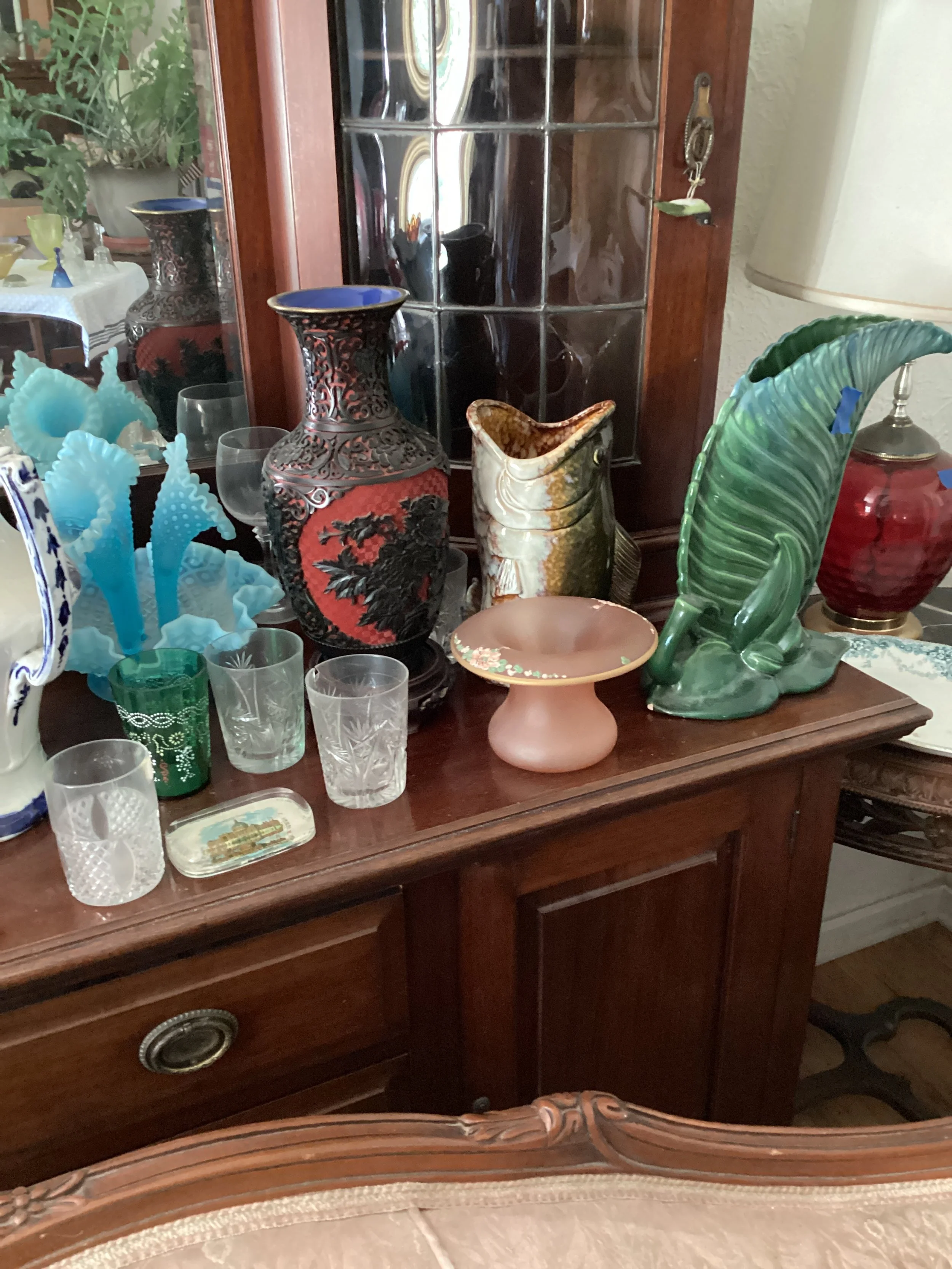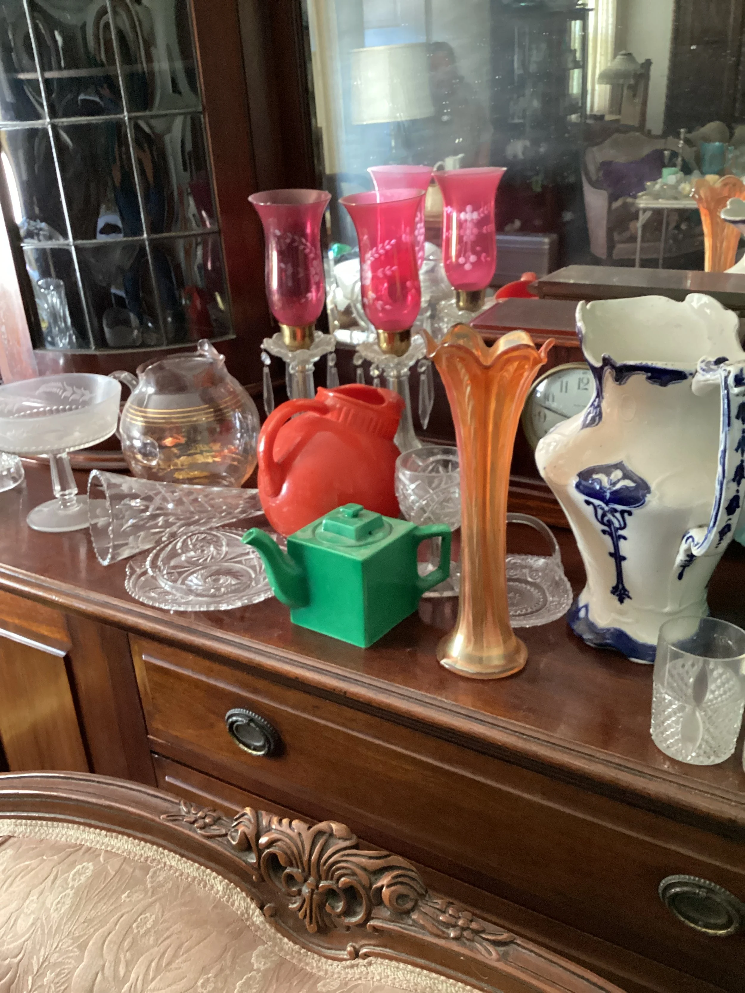 Blue, Green & Purple Glass Pitchers, Porcelain Flow Blue Plates & Serving Pcs, Ruby Red Flash Glass Pcs, Purple Glass Bowls & Sugarer & Creamer, Art Deco Glass Vases, Fenton Burmese Vase, Cobalt Blue Cut To Clear Vases, Pottery Vases, RS Prussia Hand Painted Plates & Bowls, Uranium Glass Praying Children (Fenton?), Purple Glass Funnel, Collector Plates, Pyrex, Corning Blue Cornflower, Fireking, Large Collection Of Depression Glass Several Colors, Roseville Iris Candle Stick, Flow Blue Pitcher & Wash Basin Set, Cruet Set W/ Silver Server, Haeger Pottery, McCoy Bird Pitcher, Brilliant Cut Glass, Hull Pottery, Tea Leaf Iron Stone, Large Collection Of Butter Pats, Large Collection Of Salt Dips, Milk Glass, Large Collection Of Flower Frogs, 4 Pcs Of Irish Belleek, Cake Plates, Punch Bowl By Georgus Baird, Collection Of Gravy Boats & Bone Plates, Occupied Japan Porcelain, Carnival Glass Swing Vase