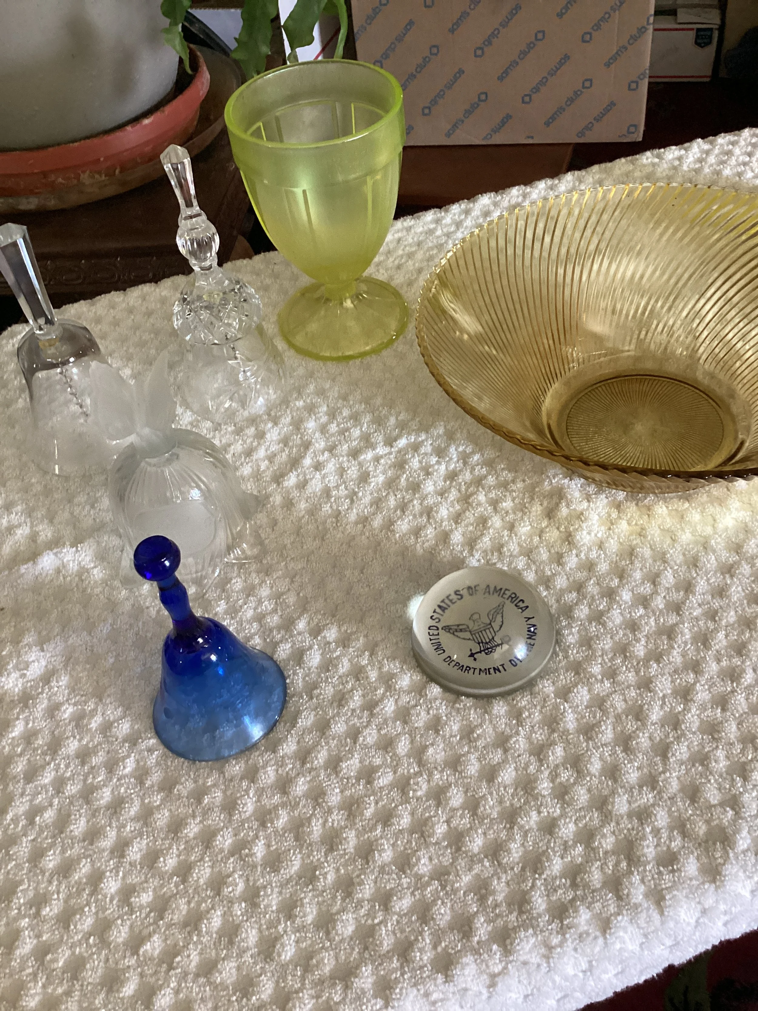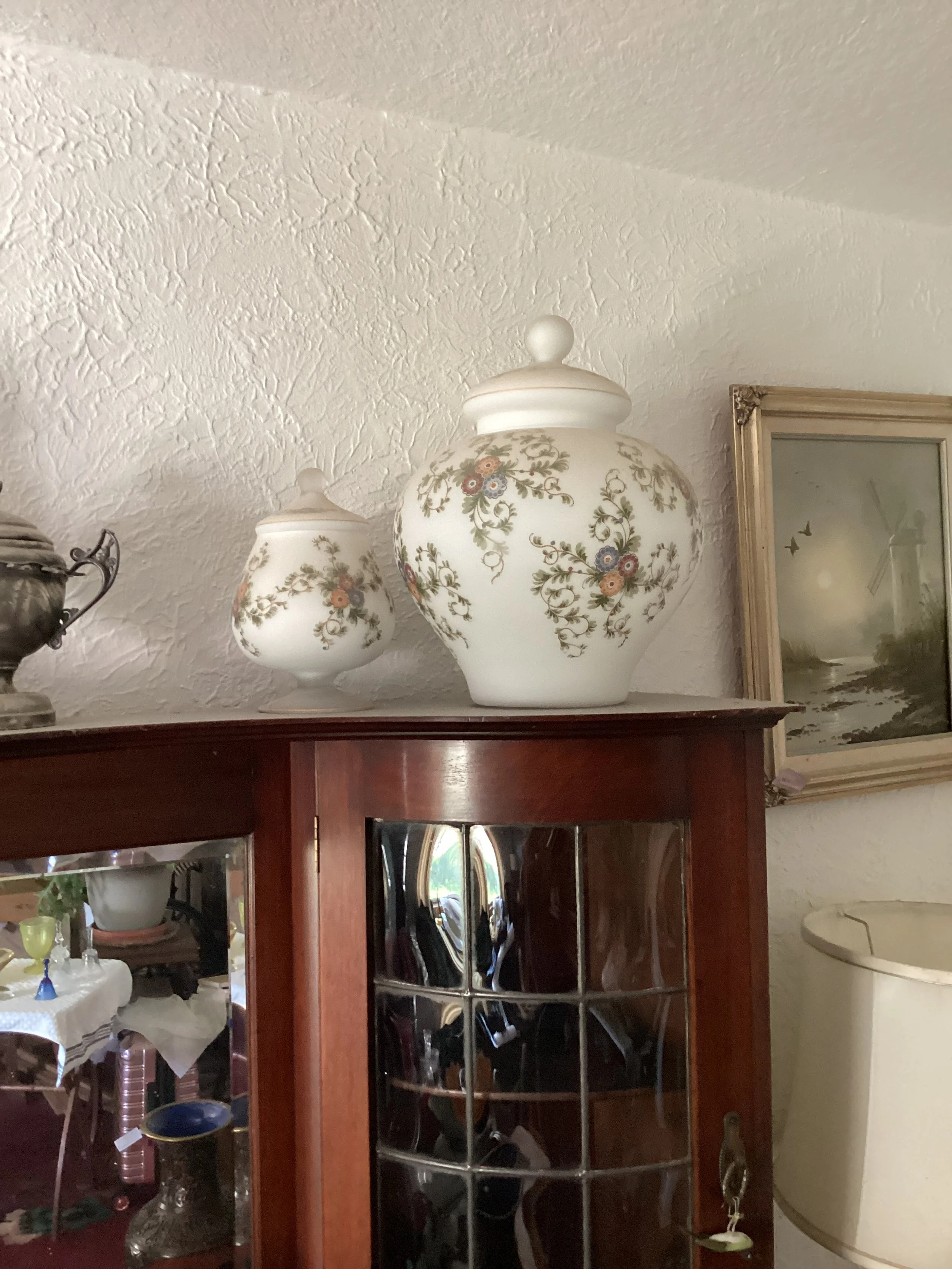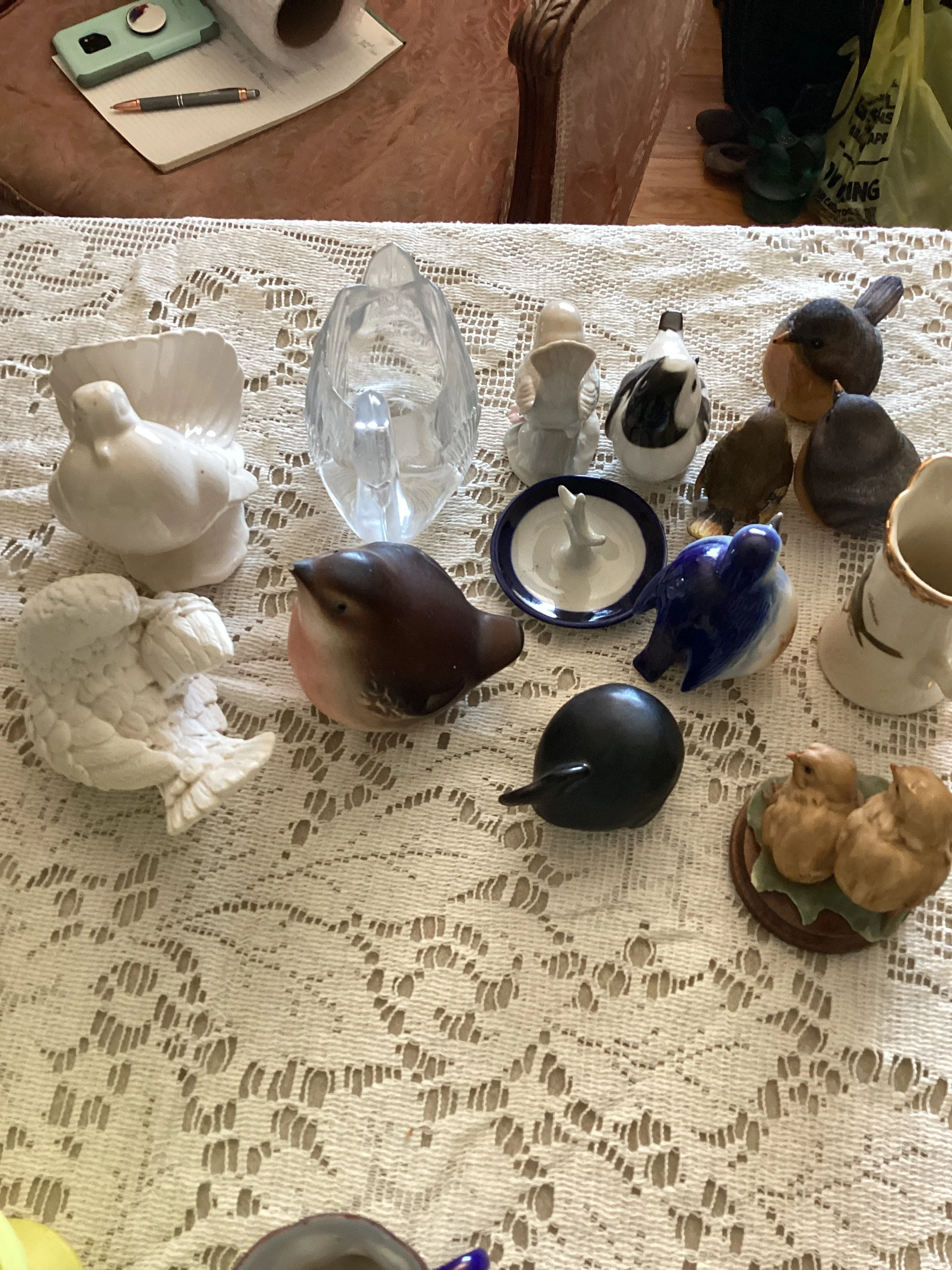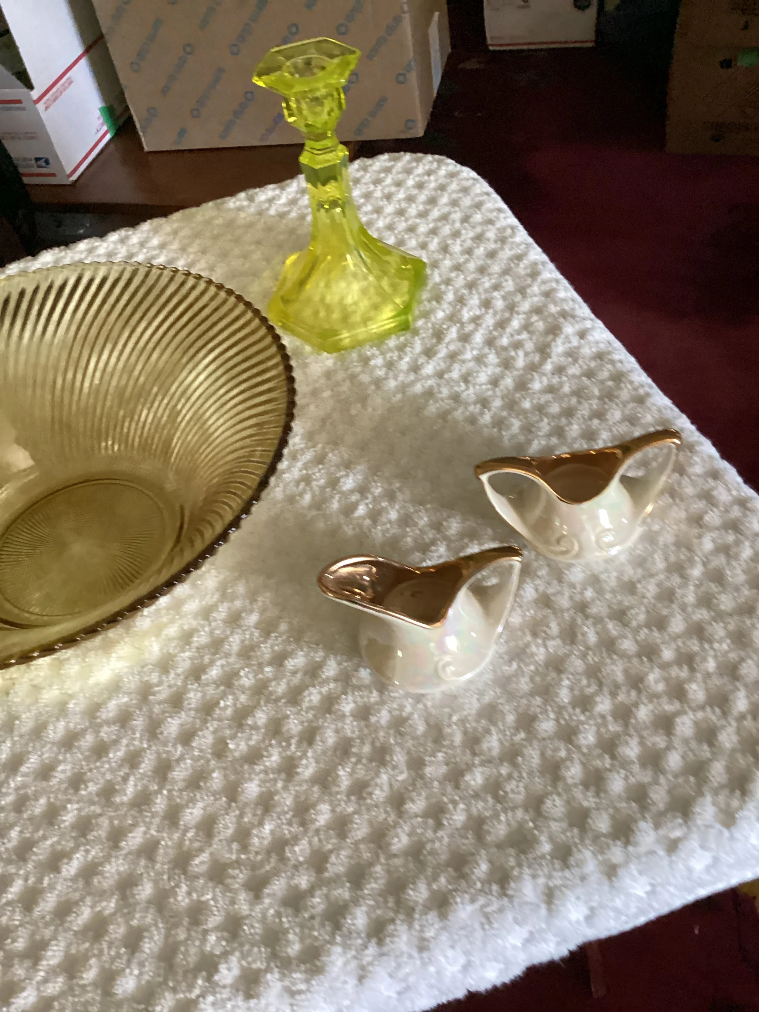 Blue, Green & Purple Glass Pitchers, Porcelain Flow Blue Plates & Serving Pcs, Ruby Red Flash Glass Pcs, Purple Glass Bowls & Sugarer & Creamer, Art Deco Glass Vases, Fenton Burmese Vase, Cobalt Blue Cut To Clear Vases, Pottery Vases, RS Prussia Hand Painted Plates & Bowls, Uranium Glass Praying Children (Fenton?), Purple Glass Funnel, Collector Plates, Pyrex, Corning Blue Cornflower, Fireking, Large Collection Of Depression Glass Several Colors, Roseville Iris Candle Stick, Flow Blue Pitcher & Wash Basin Set, Cruet Set W/ Silver Server, Haeger Pottery, McCoy Bird Pitcher, Brilliant Cut Glass, Hull Pottery, Tea Leaf Iron Stone, Large Collection Of Butter Pats, Large Collection Of Salt Dips, Milk Glass, Large Collection Of Flower Frogs, 4 Pcs Of Irish Belleek, Cake Plates, Punch Bowl By Georgus Baird, Collection Of Gravy Boats & Bone Plates, Occupied Japan Porcelain, Carnival Glass Swing Vase