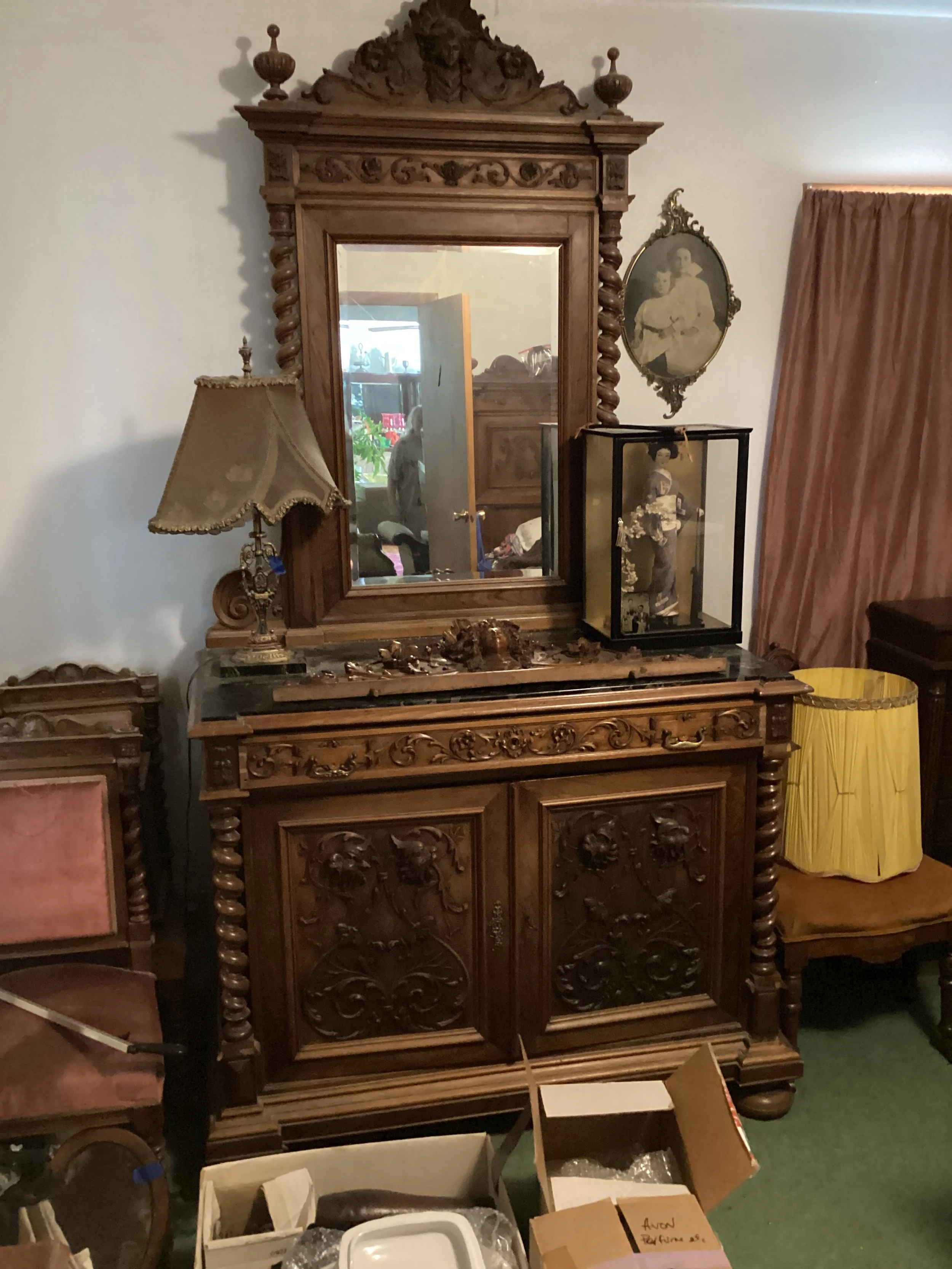 Louie 13th 7 Pc Bedroom Set, Oriental Tea Table Set W/ 4 Seats, Chairs W/ Crewel Embroidery, Blonde Twin Bedroom Set Includes Dressing Table, Square Oak Table w/ Leaves, Dining Room Chairs, Wooden Jewelry Box, Ornate Plant Stands, Wooden Shelves, Ornate Wall Clock, 4 Pressed Back Chairs, Walnut Cylinder Desk, Office Desk, Lamps, Corner Wooden Shelf, Bent Wood Chairs, Pecan Living Room Set Complete w/ Sofa, Chair, End Tables, Coffee Tables, Birdseye Maple Bedroom Set w/ Dressing Table, Wicker Sofa Table & Chair, Curved Glass China Cabinet, Mahogany Turtle Tables, Mahogany Buffet W/ Mirrored Back & Side Glass Doors Beautiful, Singer Treadle Sewing Machine, Wicker Back Rocking Chair, 2 Door Glass Front Bookshelf, 2 4-Stack Lawyers Book Cases, Beveled Glass Mirrors, Stick & Ball Room Divider, Oak Claw Foot Table, Oak Ice Box w/ Top Ice Box, Whitewashed Kitchen Hoosier Style Kitchen Cupboard, Mantel Clock, Floor Lamps