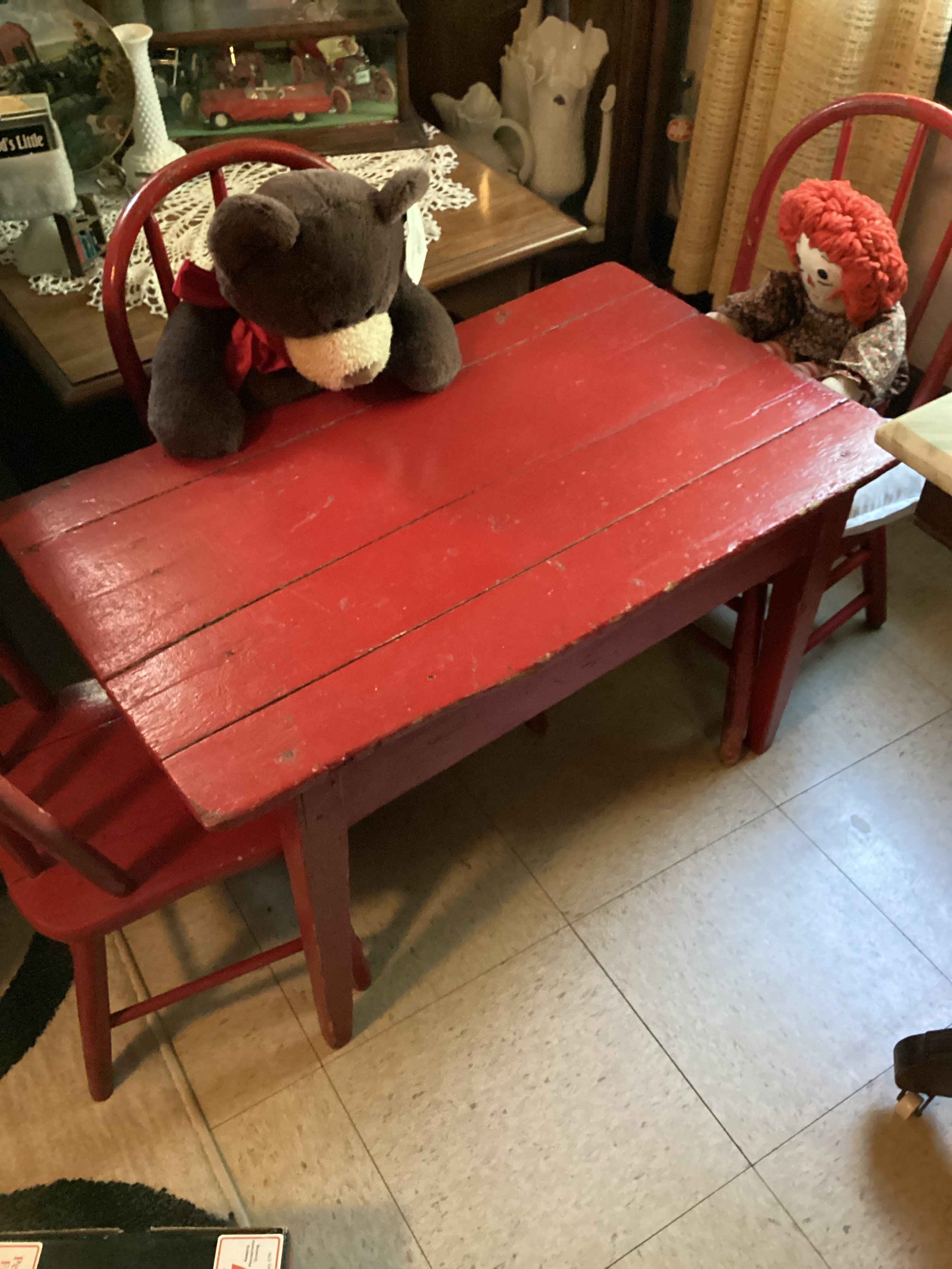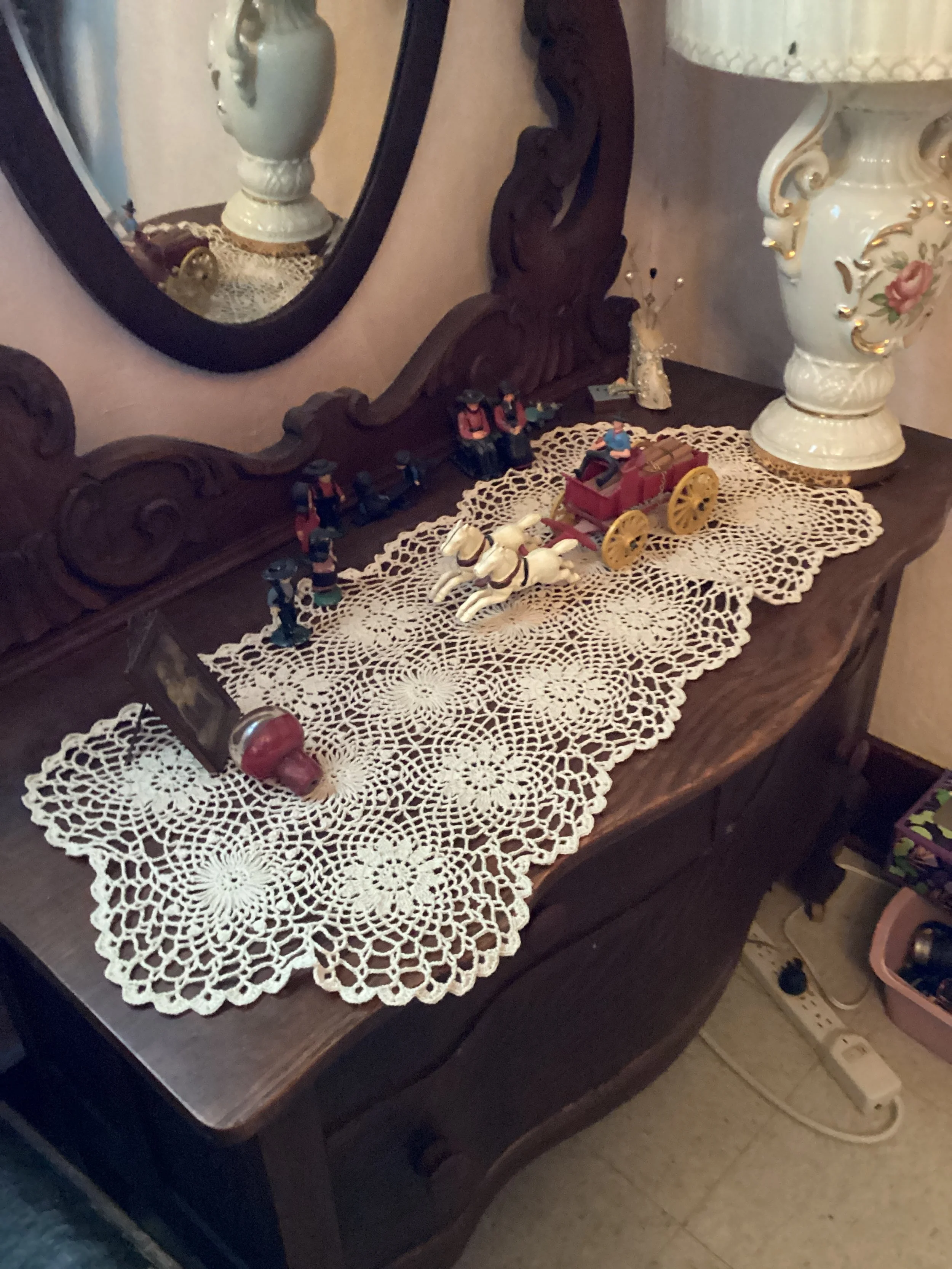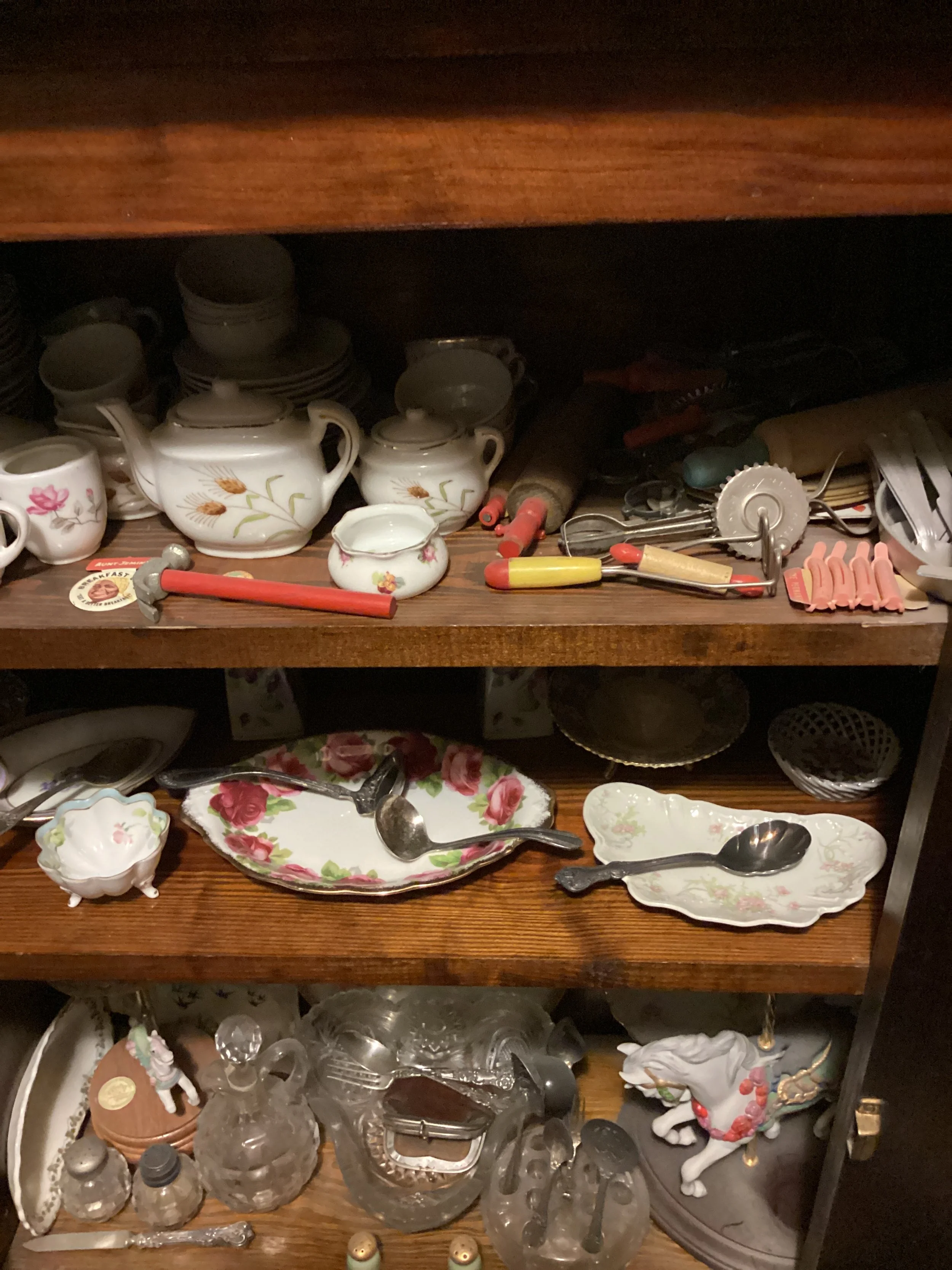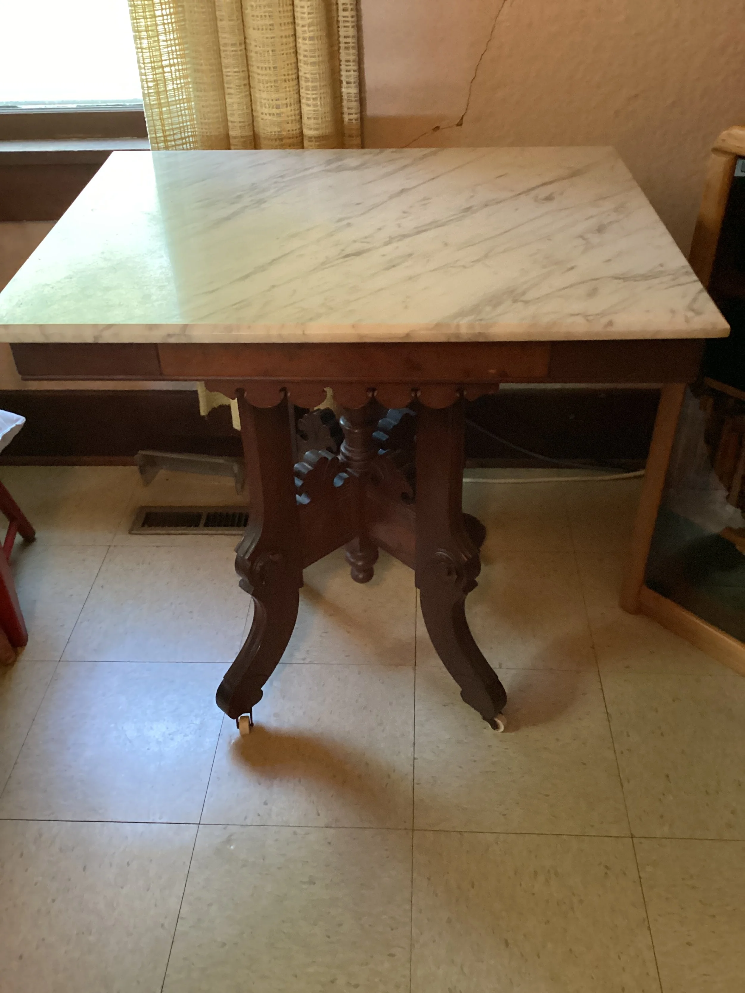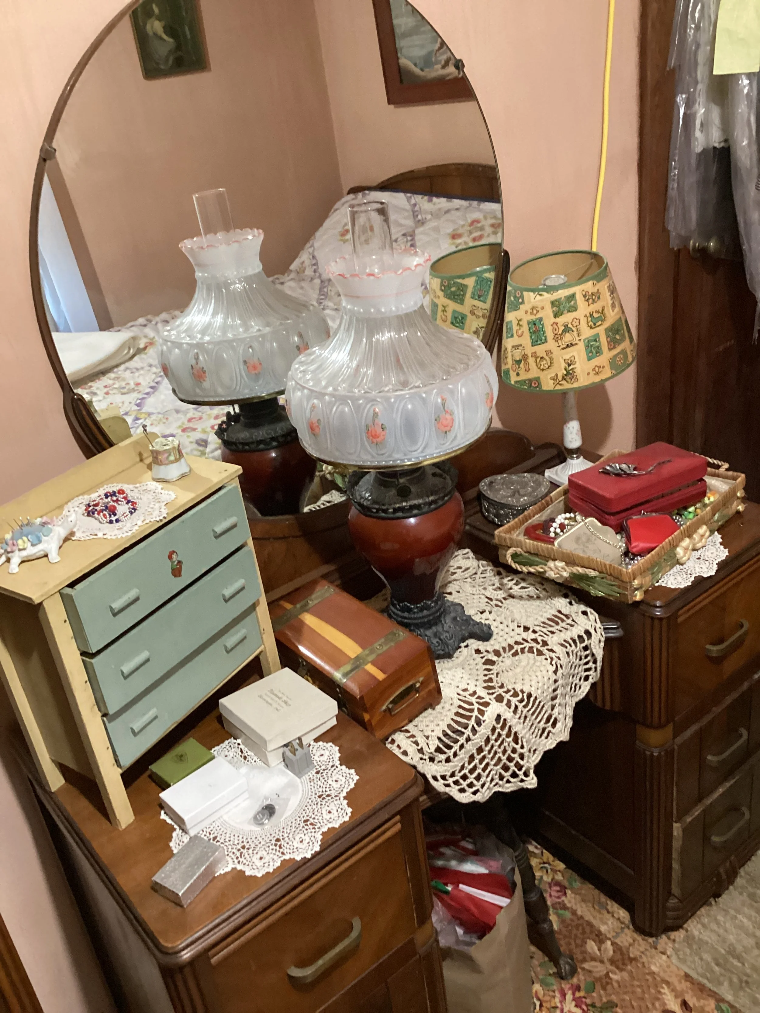 Pharmacy Countertop Oak Display Case, Princess Dresser w/ Beveled Oval Mirror, Oak Chairs, Beveled Oval Mirror in Oak Frame, Tiger Oak Armoire w/ Beveled Mirror, Magazine Rack, Marble Top Table, Primitive Child’s Table & 4 Chairs, Crewel Emb Foot Stool, Detailed Eastlake Teacart w/ Glass Top Tray, Wooden Stool, Duncan Phyfe Table, 2 Door Chimney Metal Cupboard, 1950’s Mid-Century Mod Turner Flamingo Print, Camel Back Trunk, Trundle Bed, Thunder Mug, Etched Bathroom Mirror, Several Bedroom Lamps, 3 Pc 1940’s Bedroom Set, Eastlake Scrolled Legged Table, Rocking Chair, Commode/Dry Sink, Card Tables, Folding Chairs, Barrister Case, Church Lectern from Grant Catholic Church