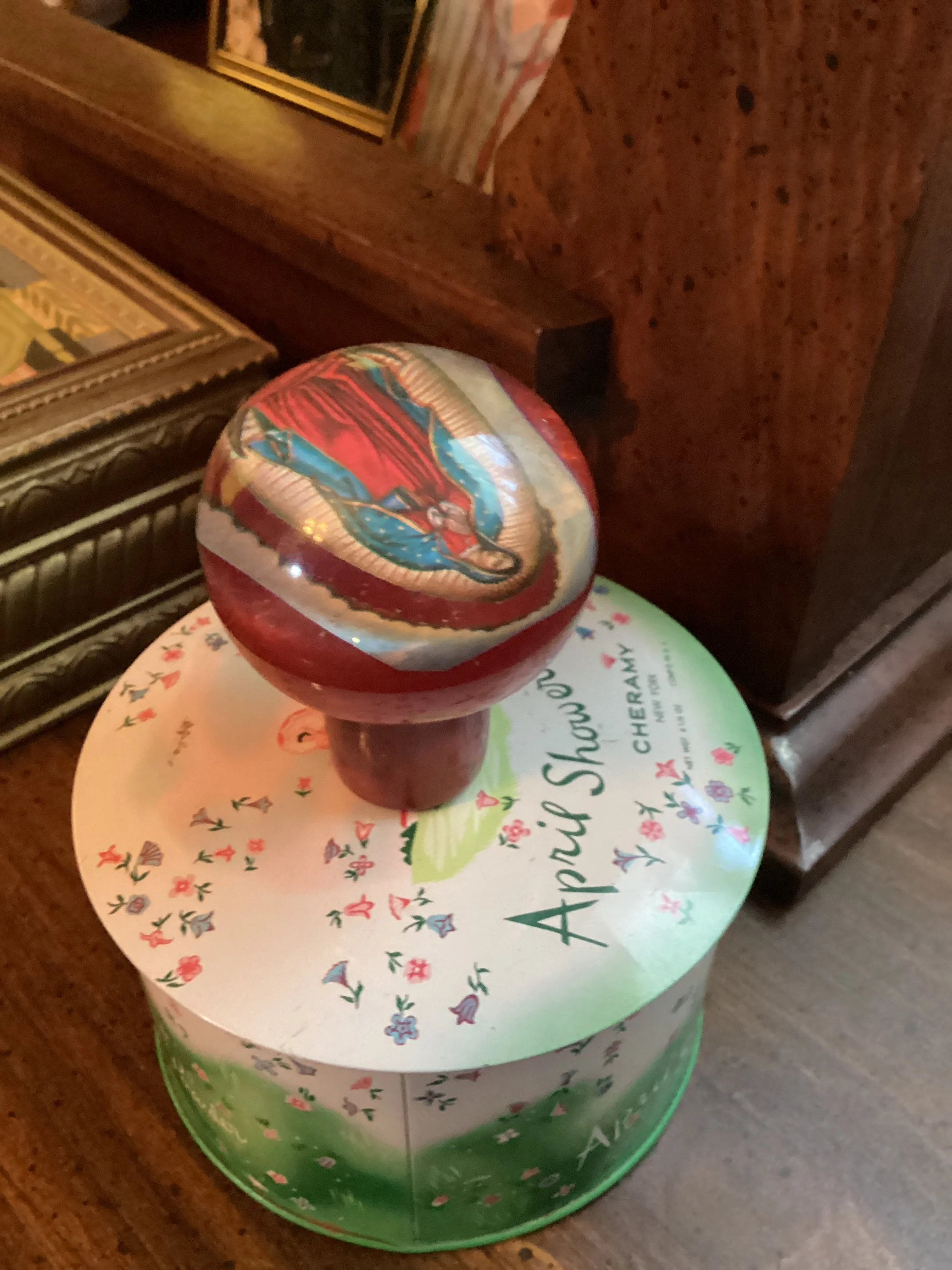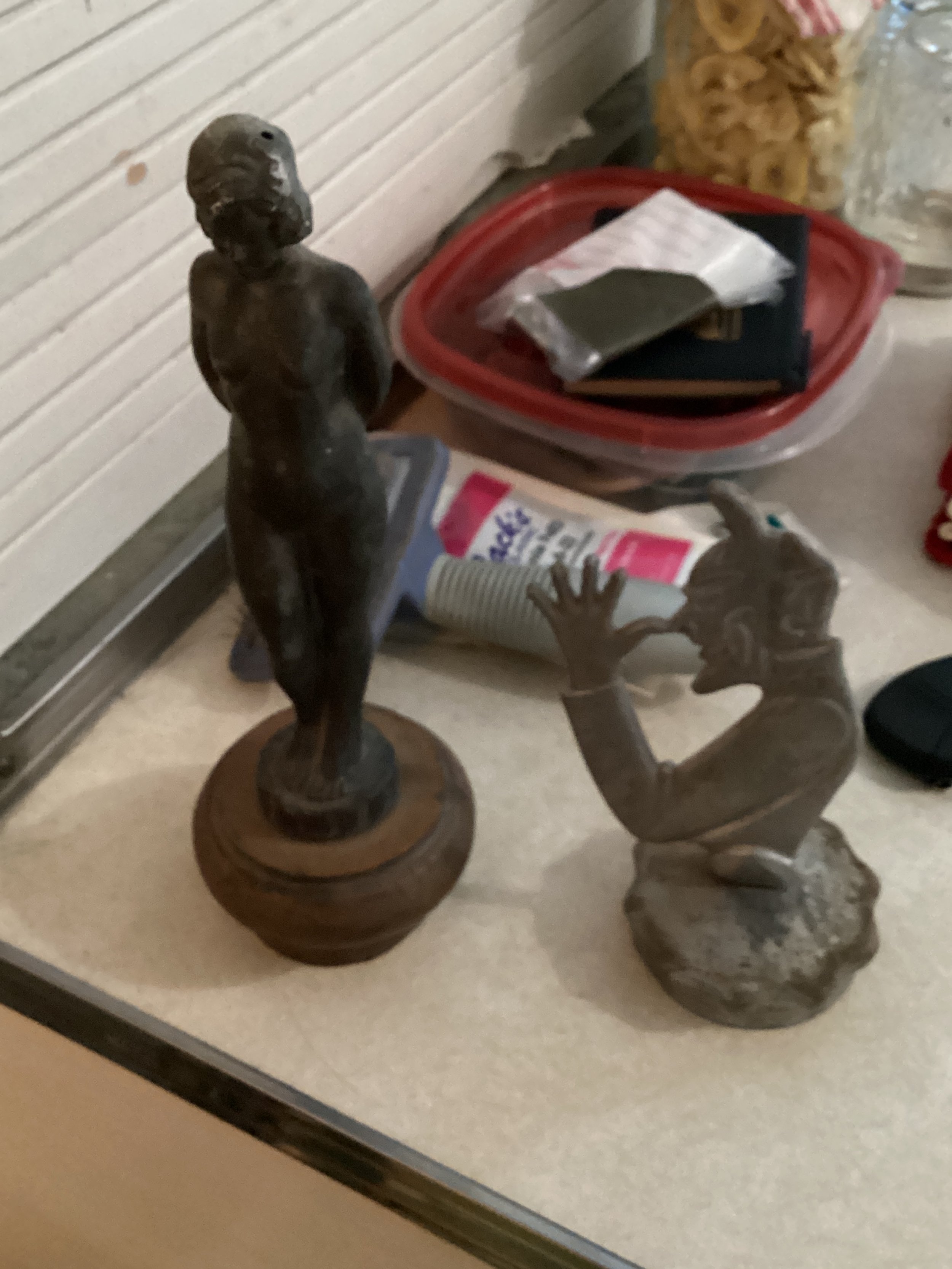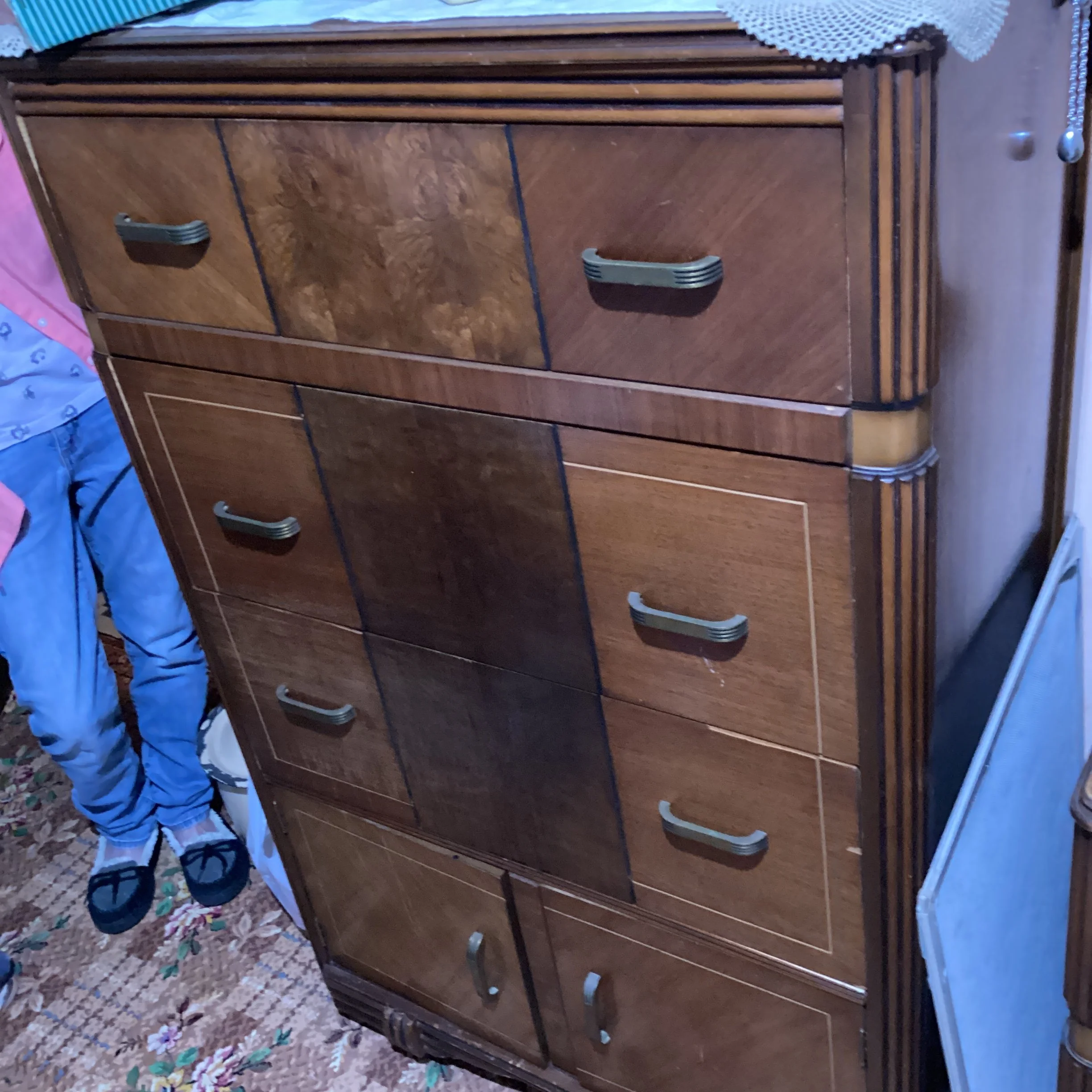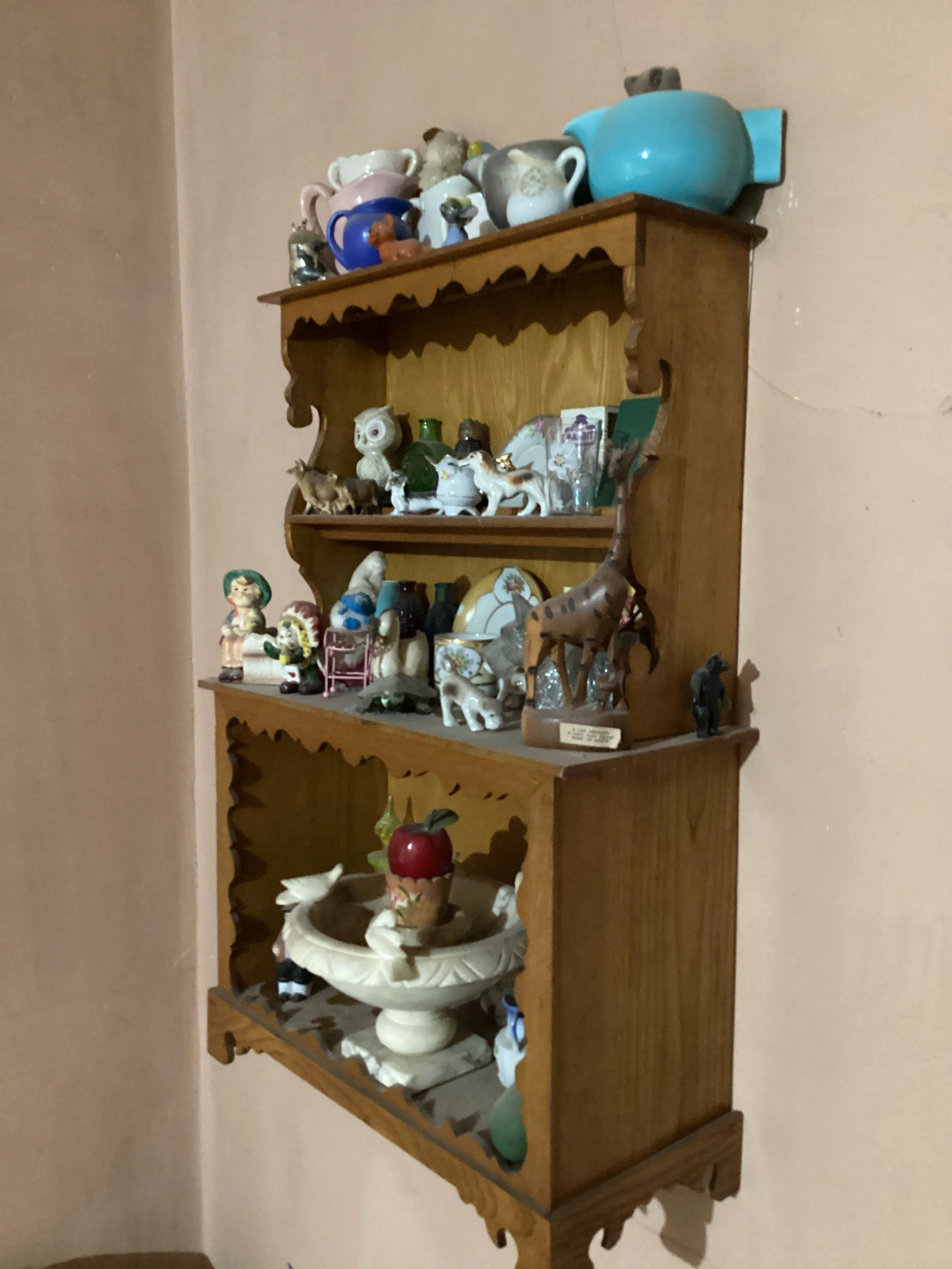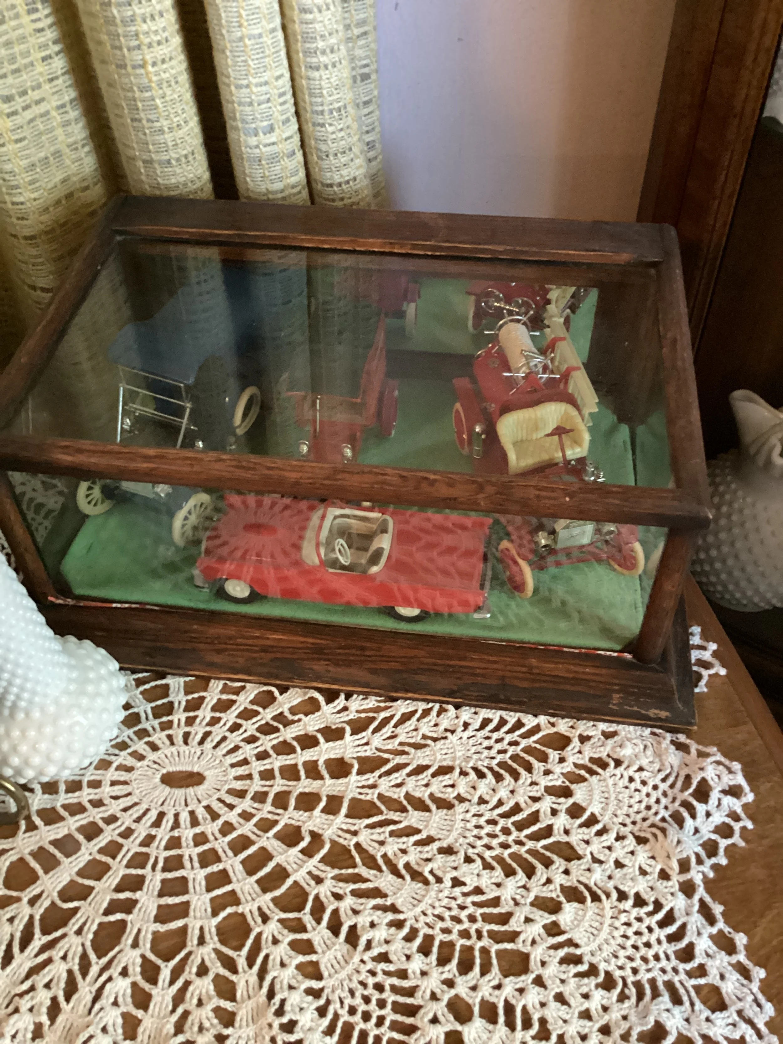 Pharmacy Countertop Oak Display Case, Princess Dresser w/ Beveled Oval Mirror, Oak Chairs, Beveled Oval Mirror in Oak Frame, Tiger Oak Armoire w/ Beveled Mirror, Magazine Rack, Marble Top Table, Primitive Child’s Table & 4 Chairs, Crewel Emb Foot Stool, Detailed Eastlake Teacart w/ Glass Top Tray, Wooden Stool, Duncan Phyfe Table, 2 Door Chimney Metal Cupboard, 1950’s Mid-Century Mod Turner Flamingo Print, Camel Back Trunk, Trundle Bed, Thunder Mug, Etched Bathroom Mirror, Several Bedroom Lamps, 3 Pc 1940’s Bedroom Set, Eastlake Scrolled Legged Table, Rocking Chair, Commode/Dry Sink, Card Tables, Folding Chairs, Barrister Case, Church Lectern from Grant Catholic Church