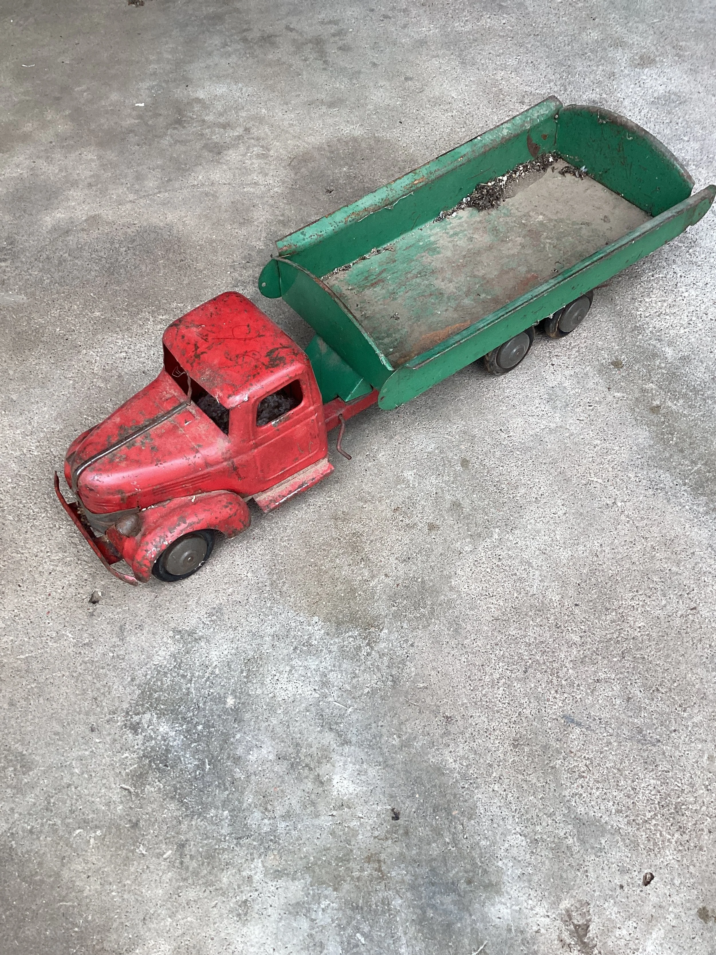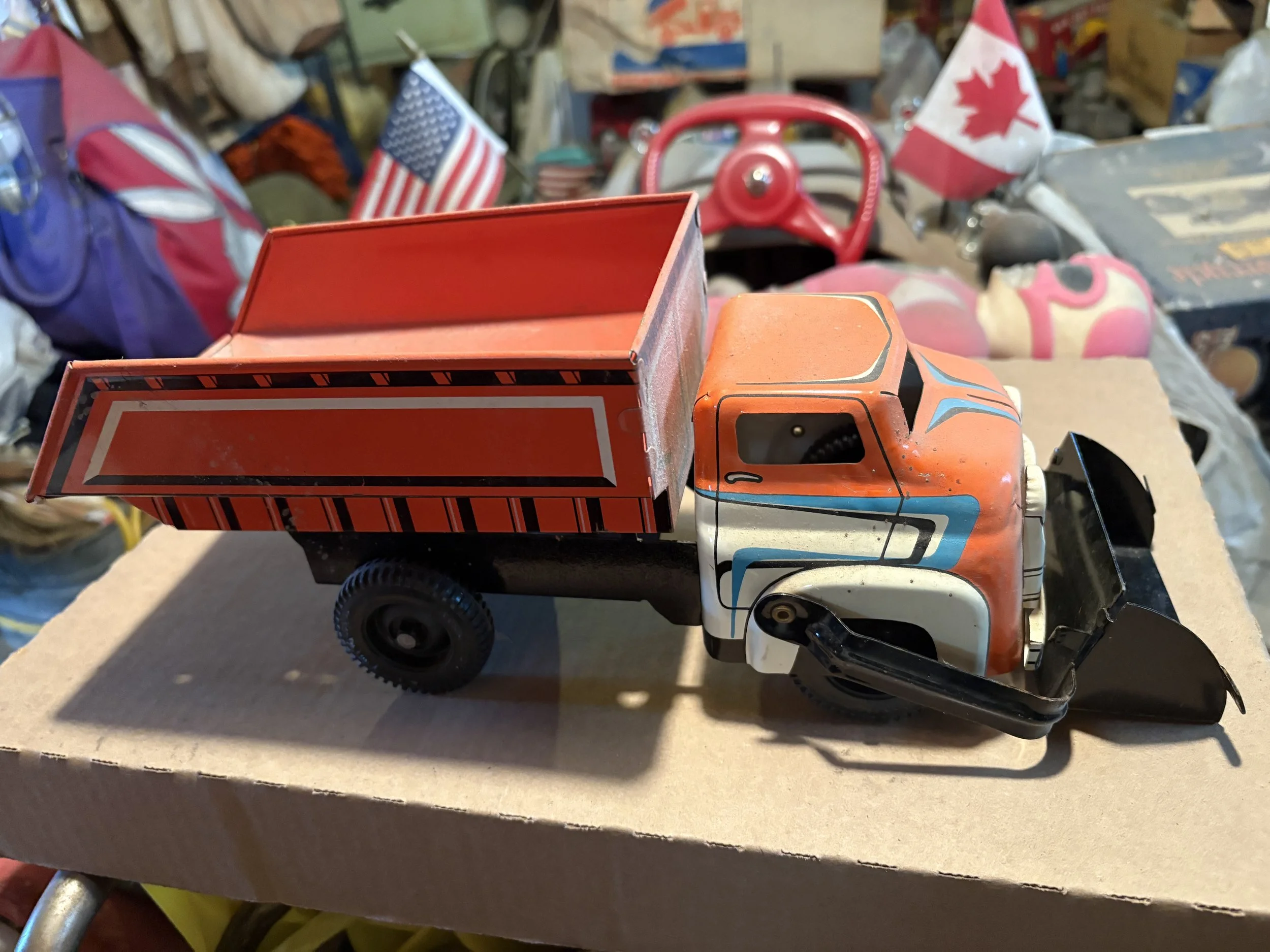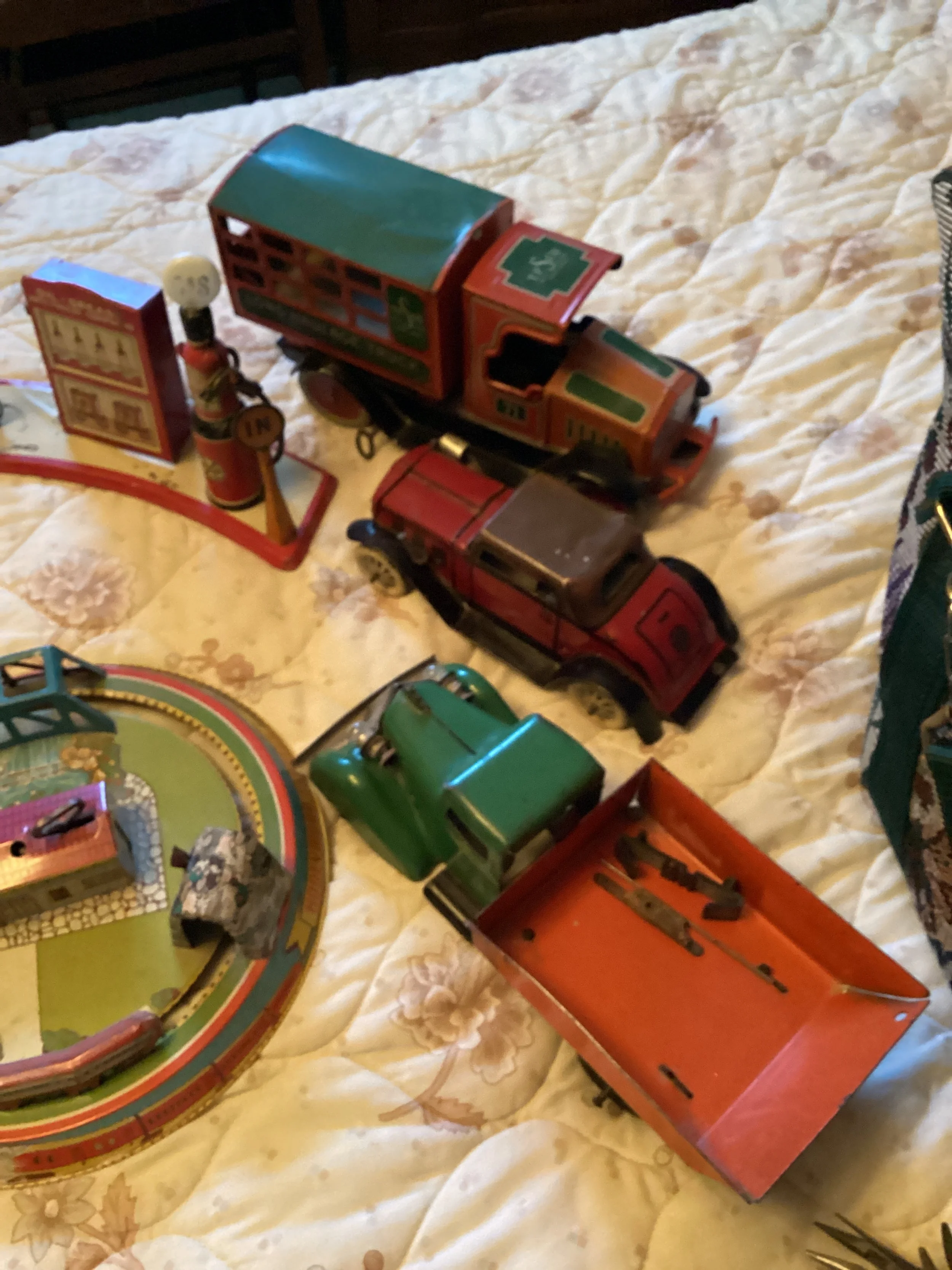 Sand Truck, Coop Long Haulage Truck, 1940’S Service Station Island, Honeymoon Express Train, Felix the Cat Litho Pull Toy, Farm Set, Mickey Mouse, Marx Superpower Snap Caterpillar Climbing Tractor, Wyandotte/Louis Marx 1950’S Front Shovel Sand Dump Truck
