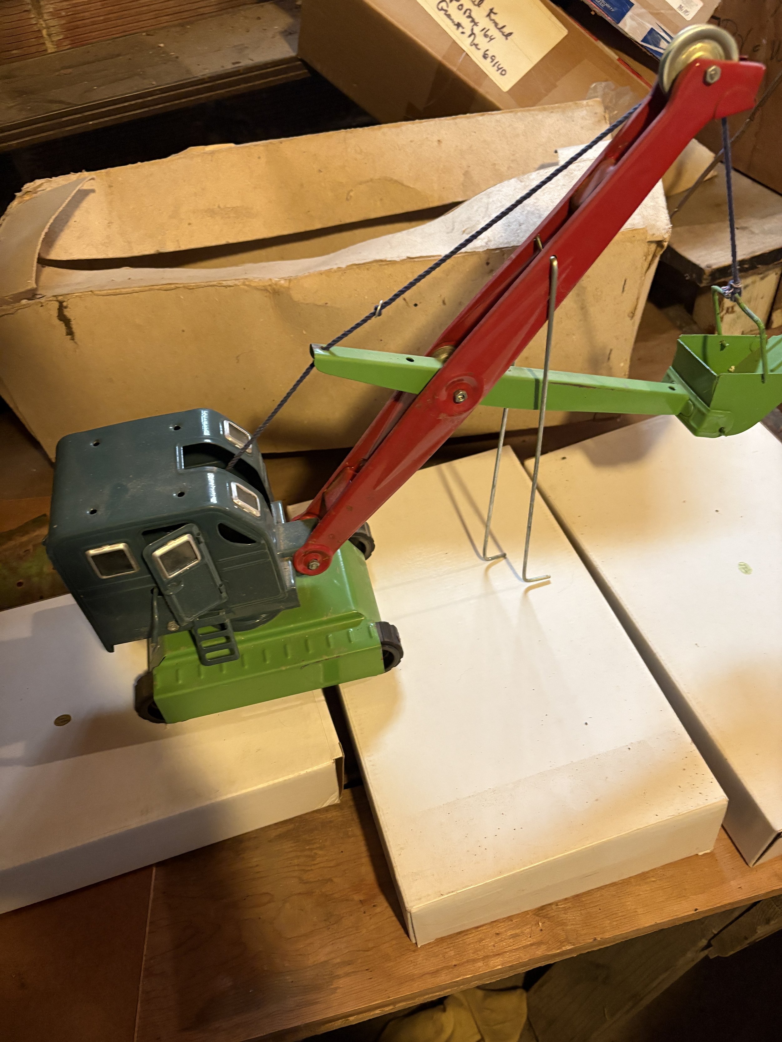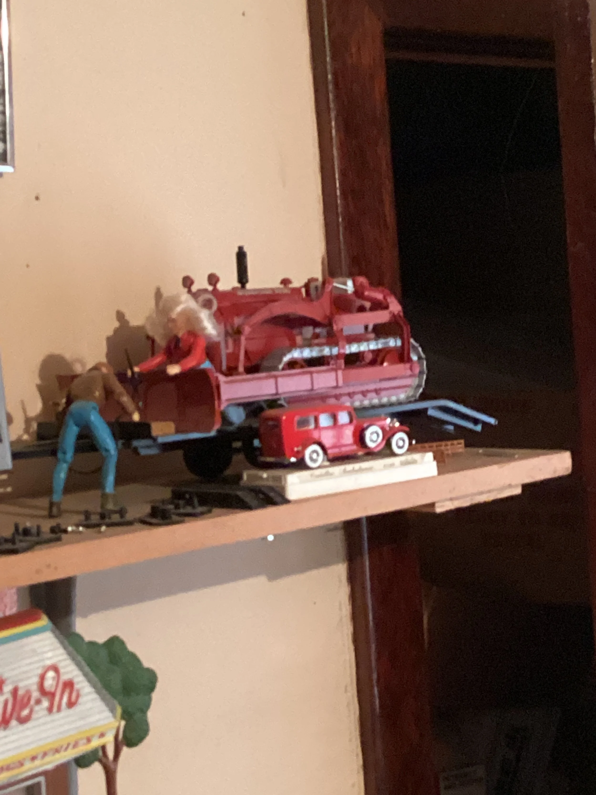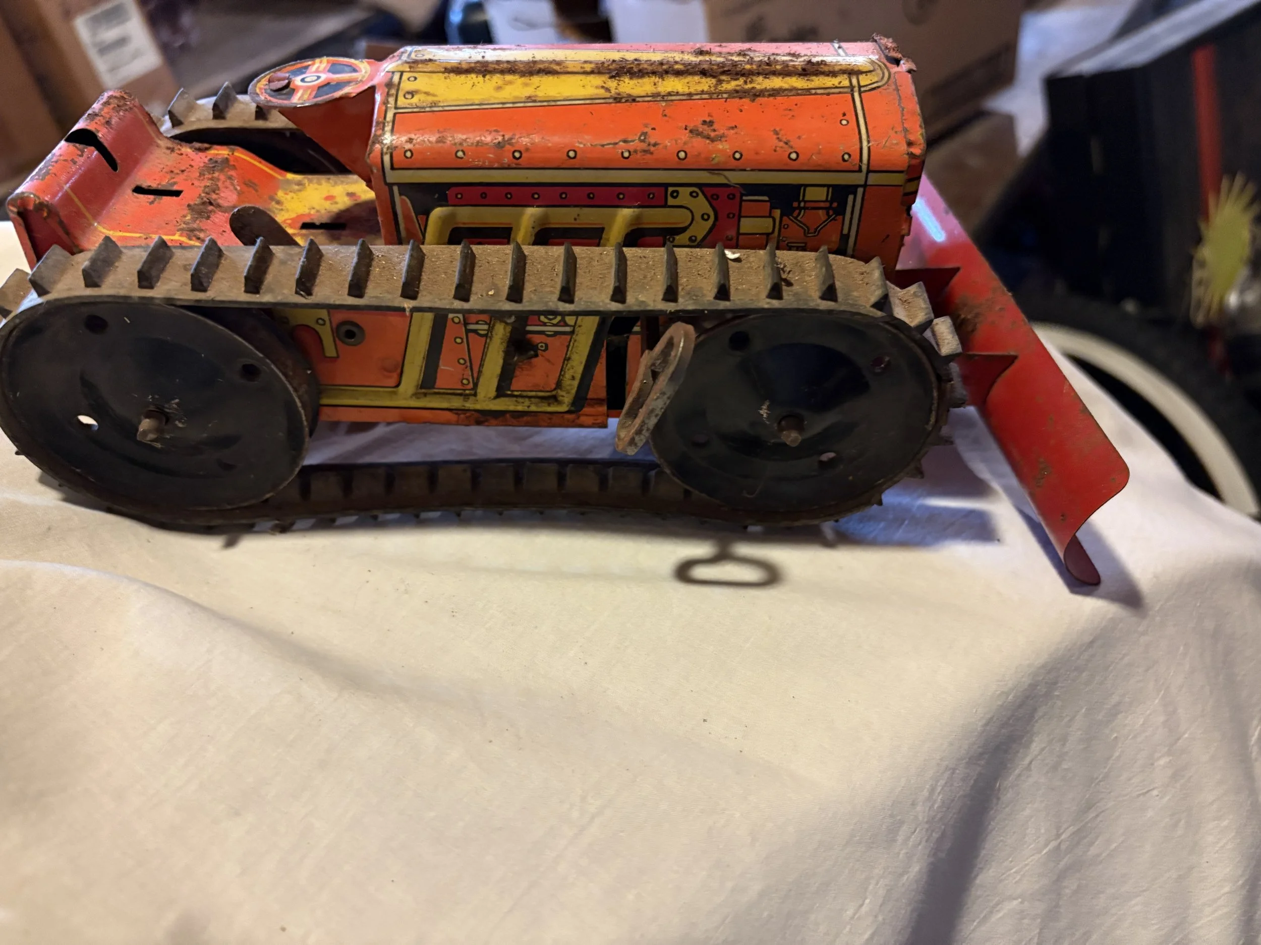Sand Truck, Coop Long Haulage Truck, 1940’S Service Station Island, Honeymoon Express Train, Felix the Cat Litho Pull Toy, Farm Set, Mickey Mouse, Marx Superpower Snap Caterpillar Climbing Tractor, Wyandotte/Louis Marx 1950’S Front Shovel Sand Dump Truck