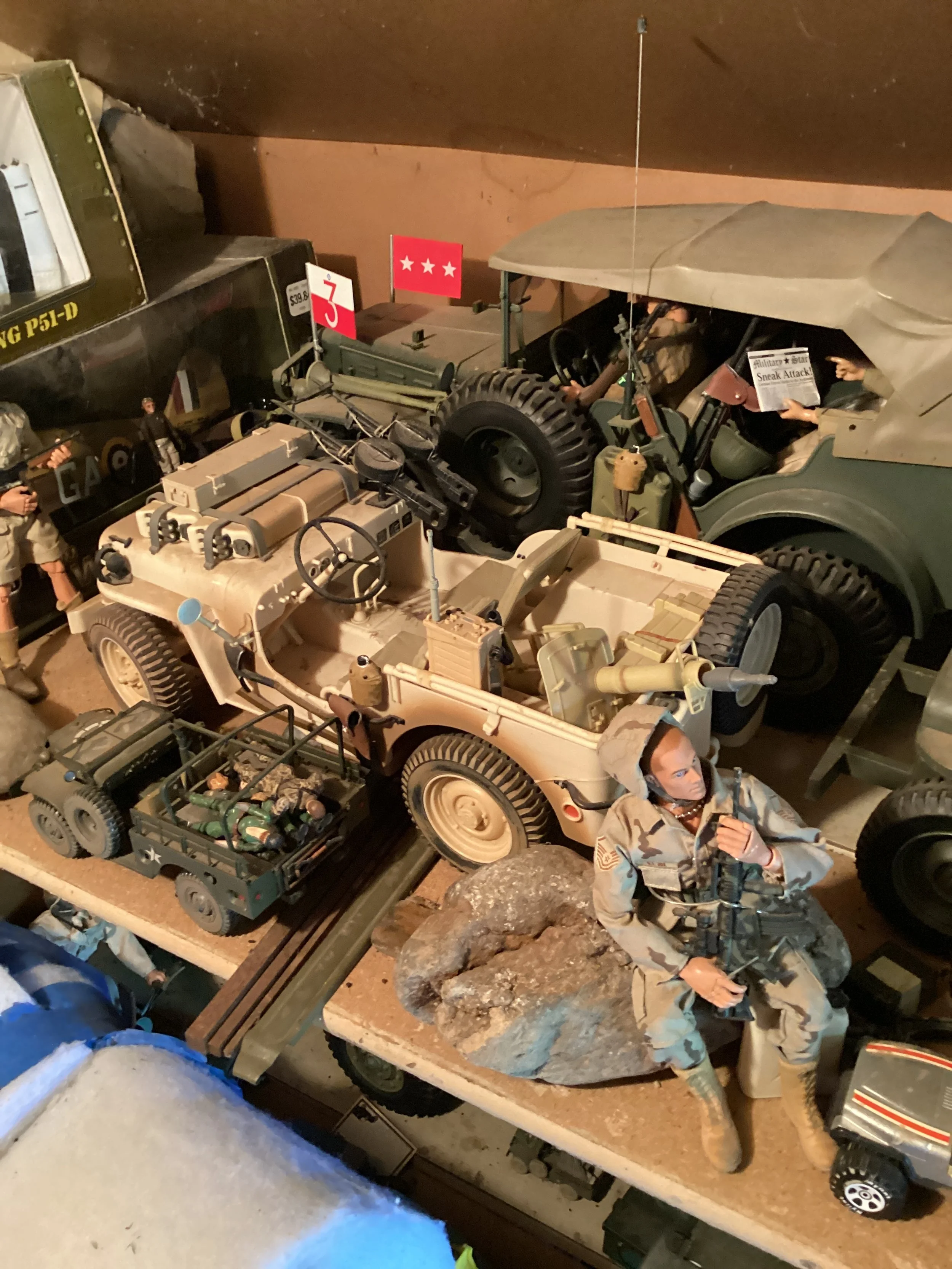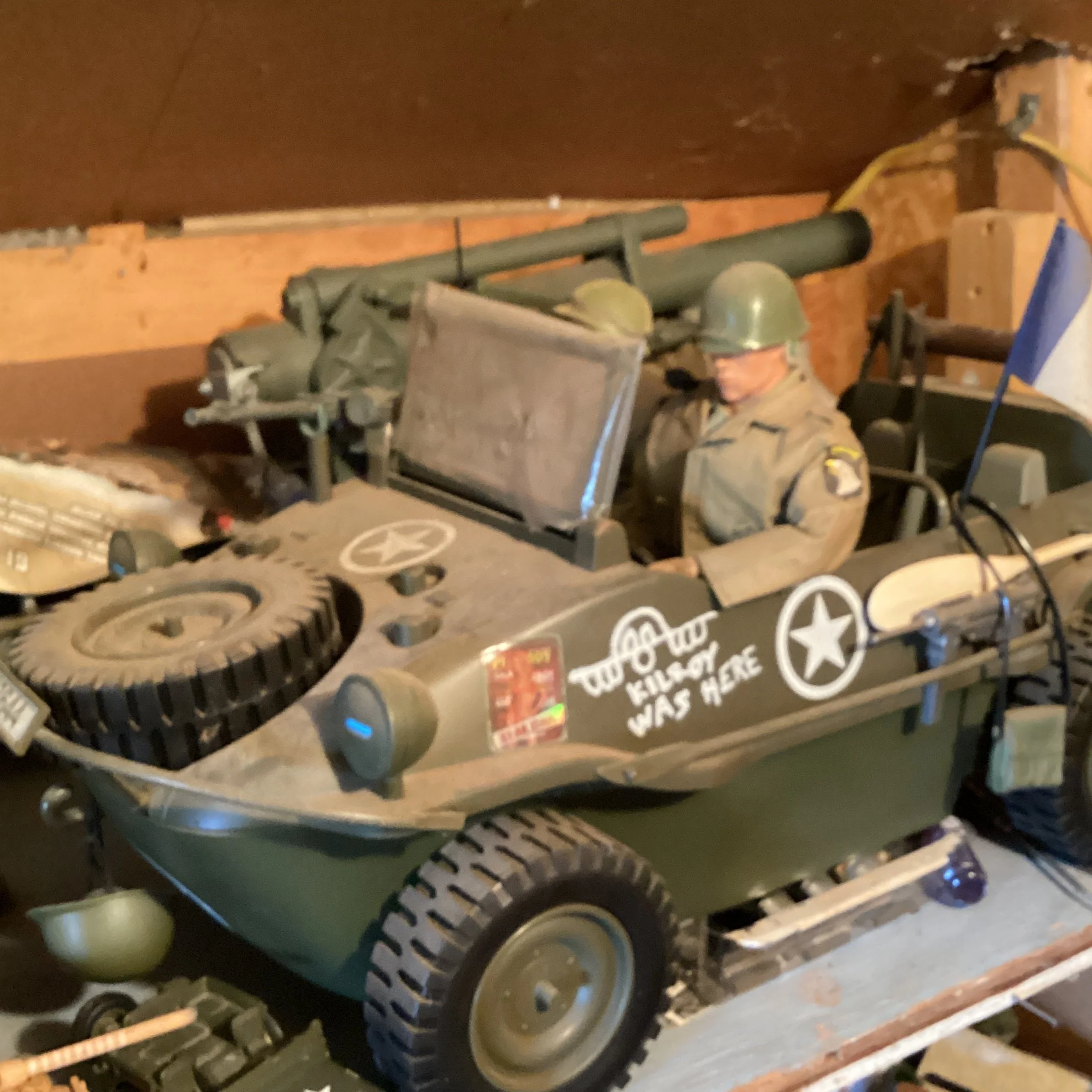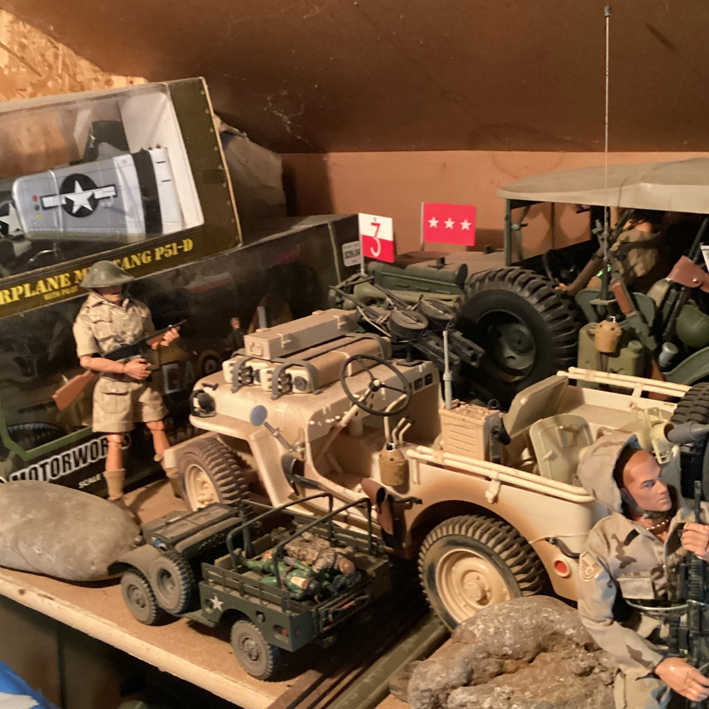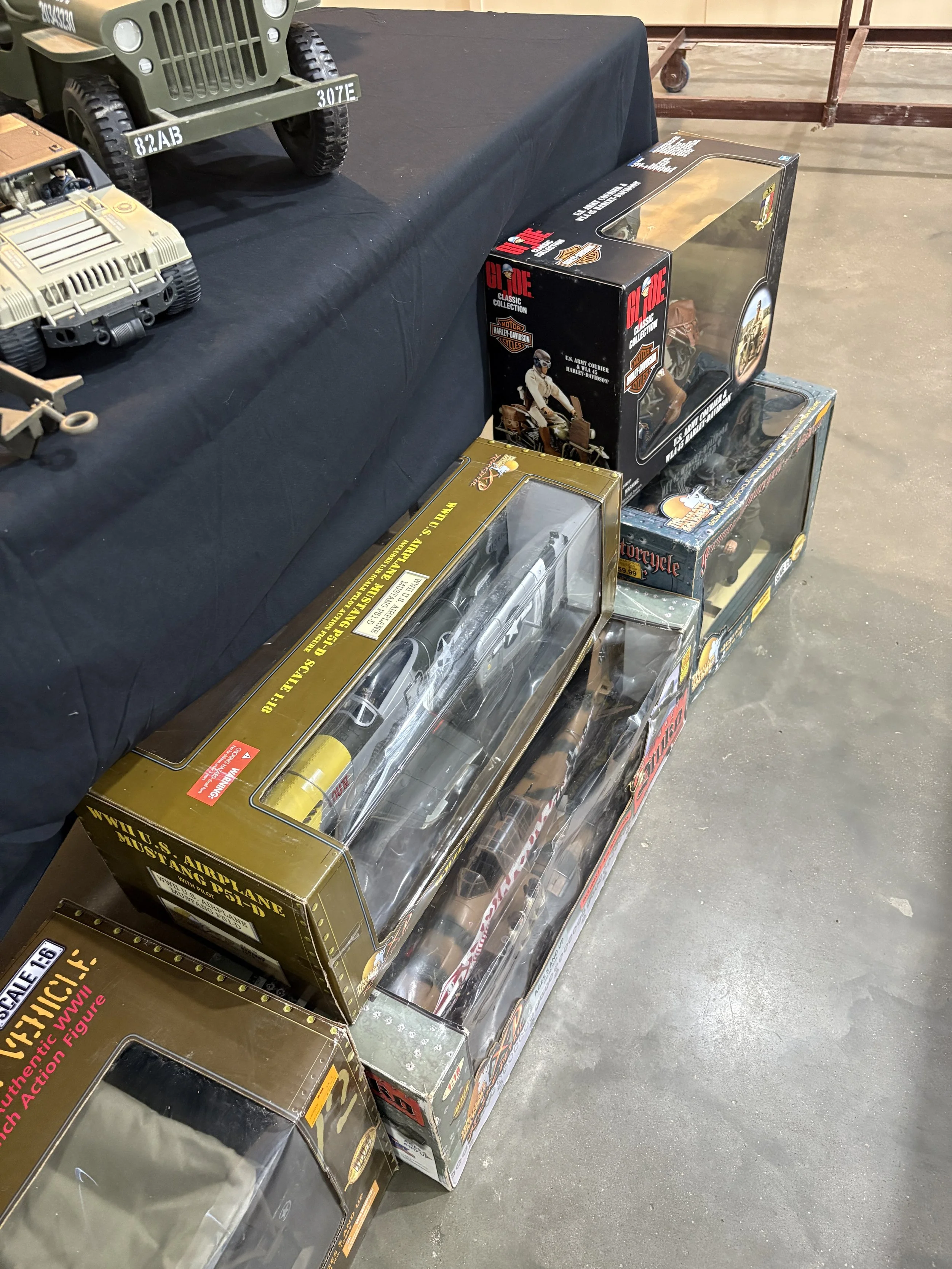 Large Collection of GI Joe Dolls, Jeeps, Tanks, Cannons & Toys Some Still Boxed. Helicopter Complete W/ Guns & Dolls, US Army Courier WLA 45 Harley Davidson NIB
