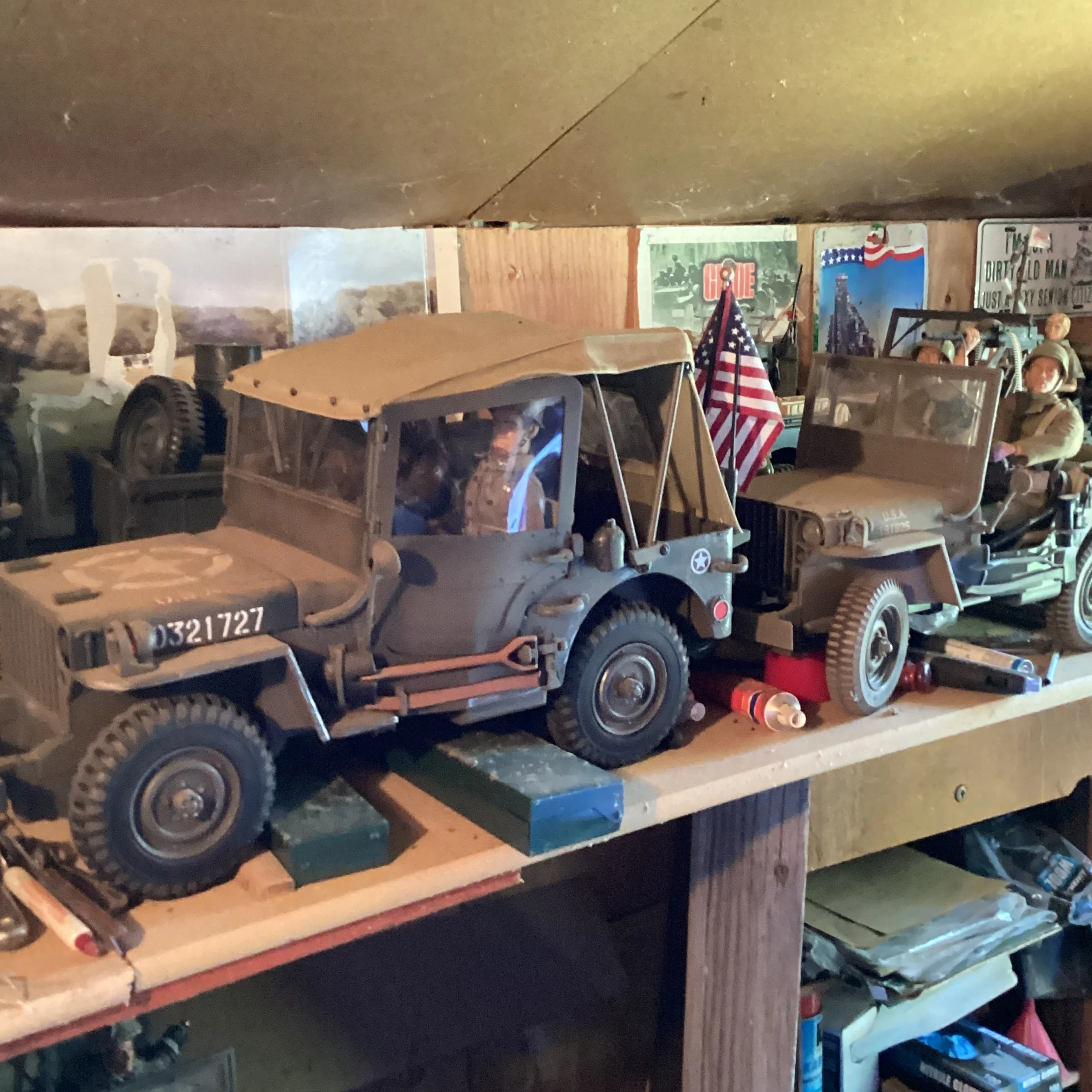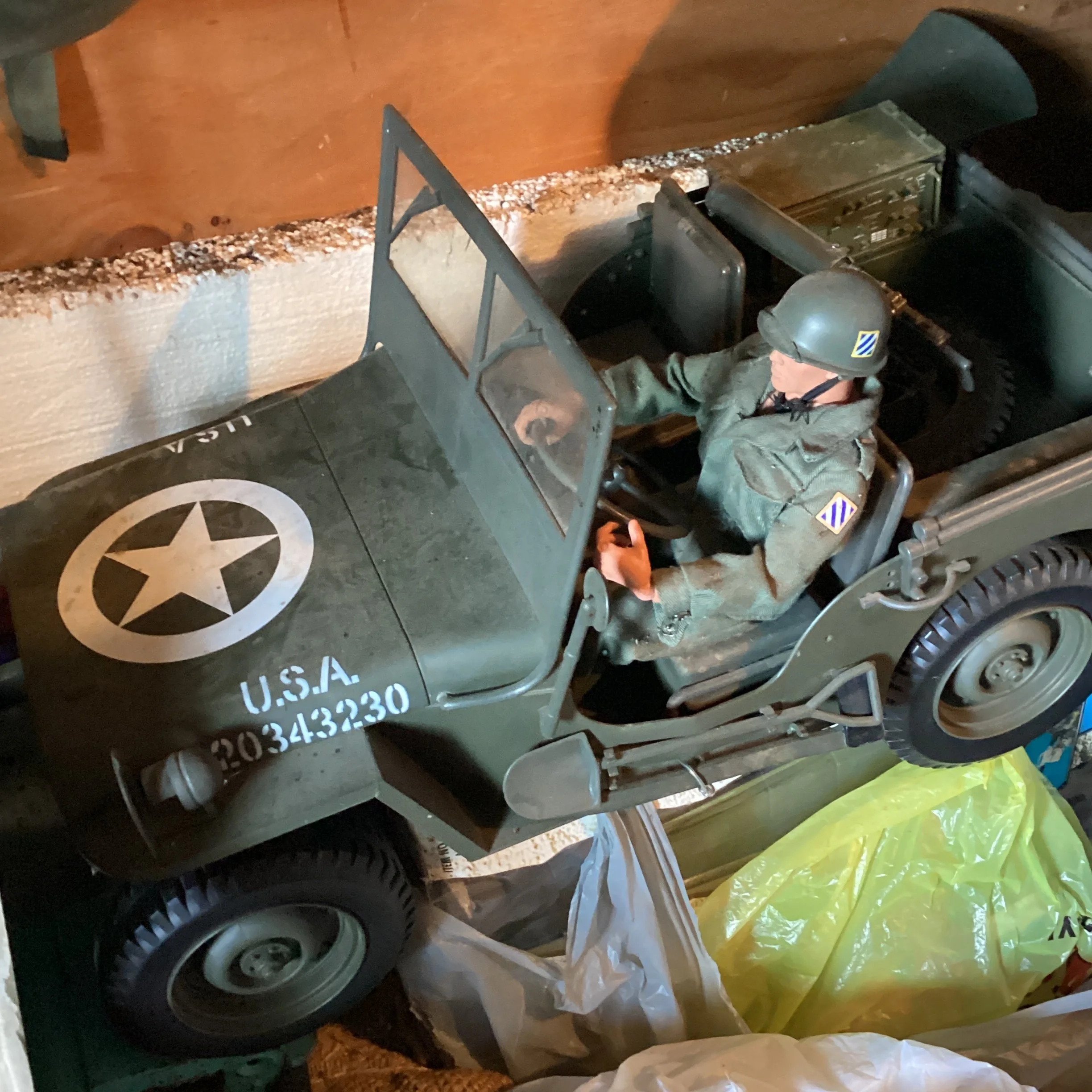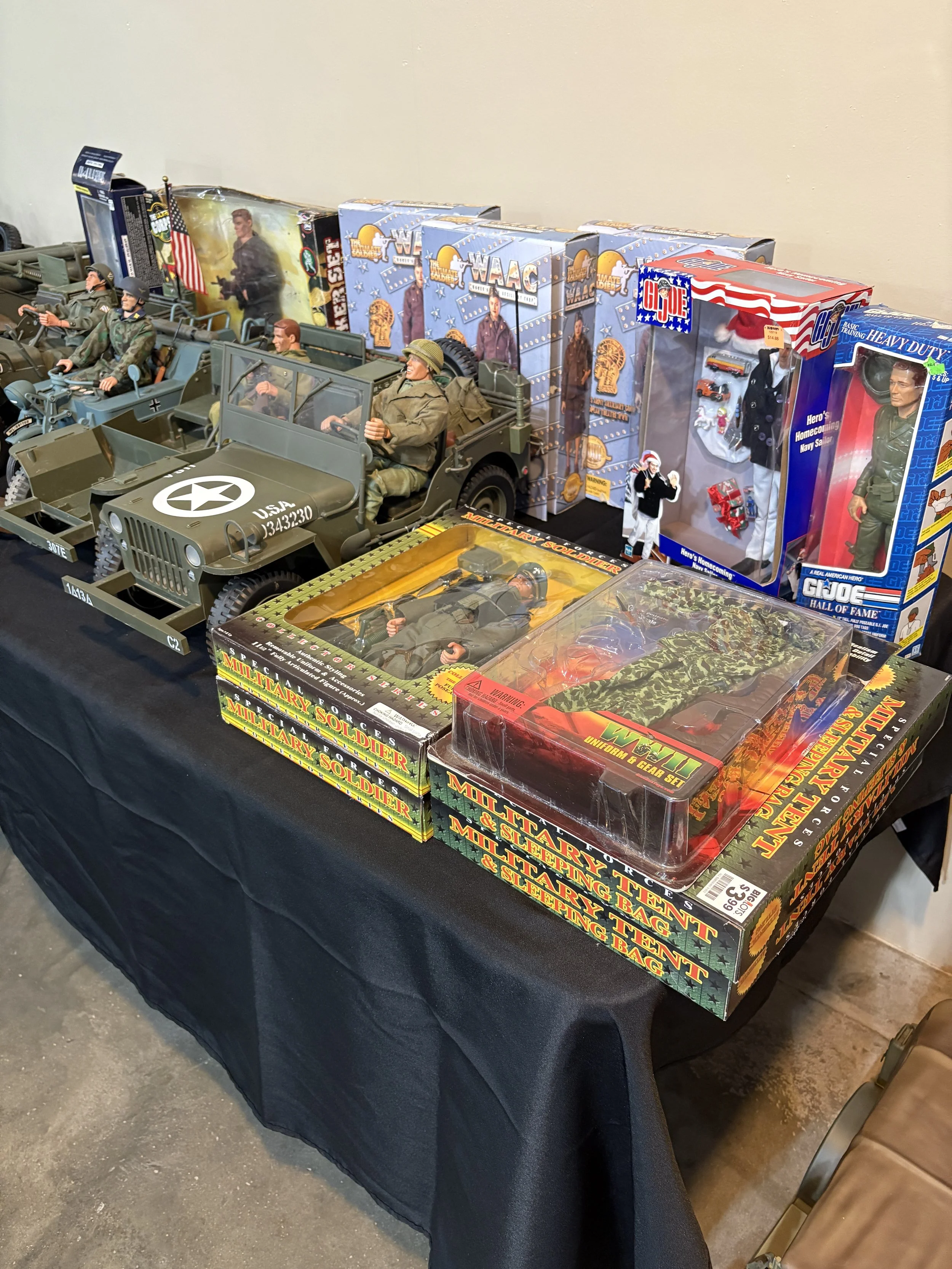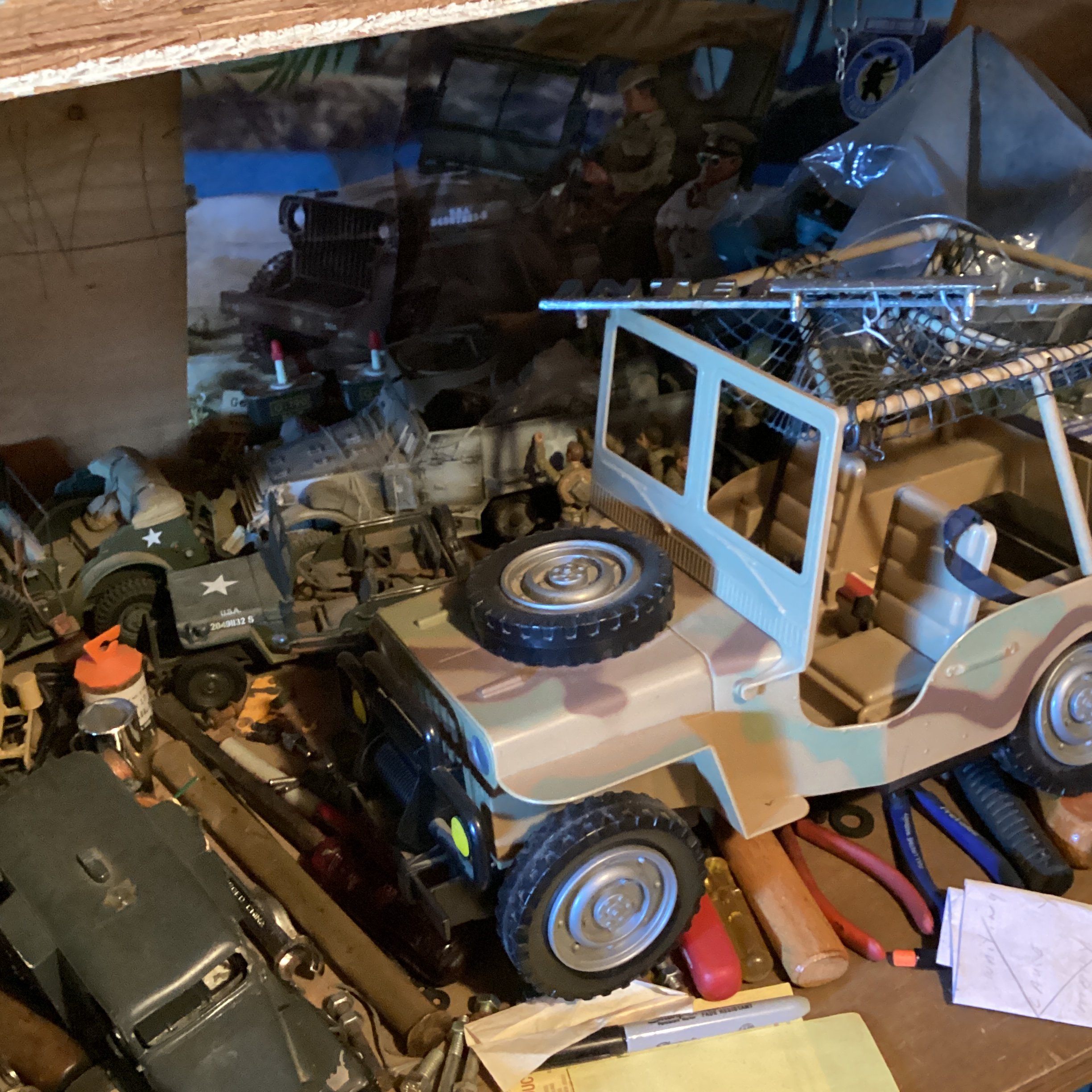 Large Collection of GI Joe Dolls, Jeeps, Tanks, Cannons & Toys Some Still Boxed. Helicopter Complete W/ Guns & Dolls, US Army Courier WLA 45 Harley Davidson NIB