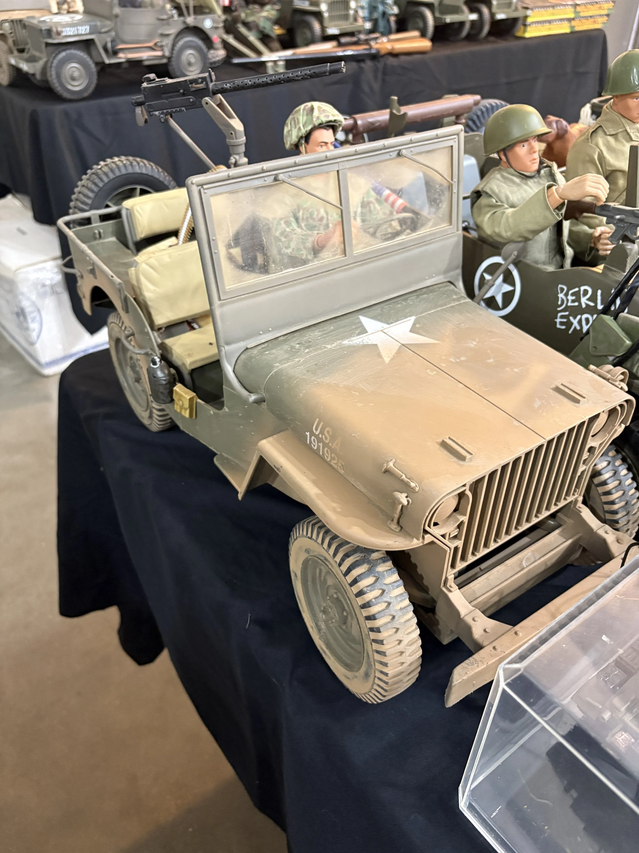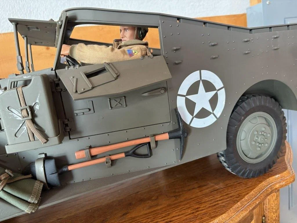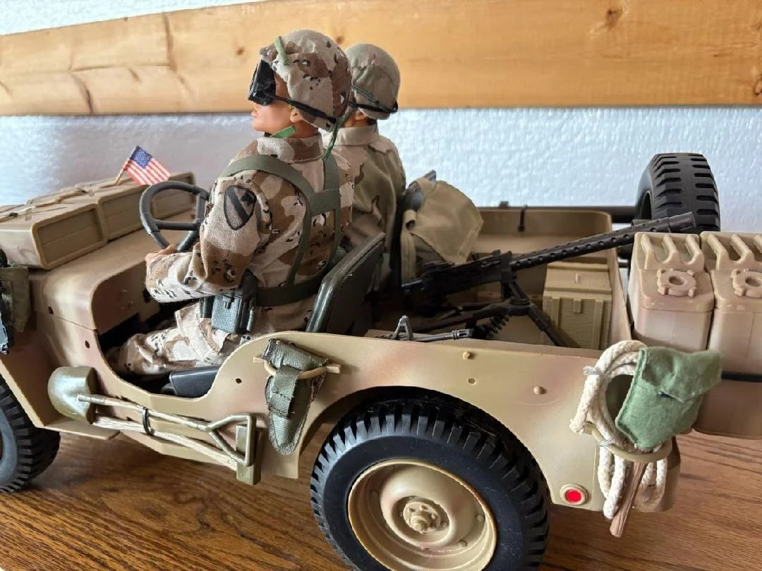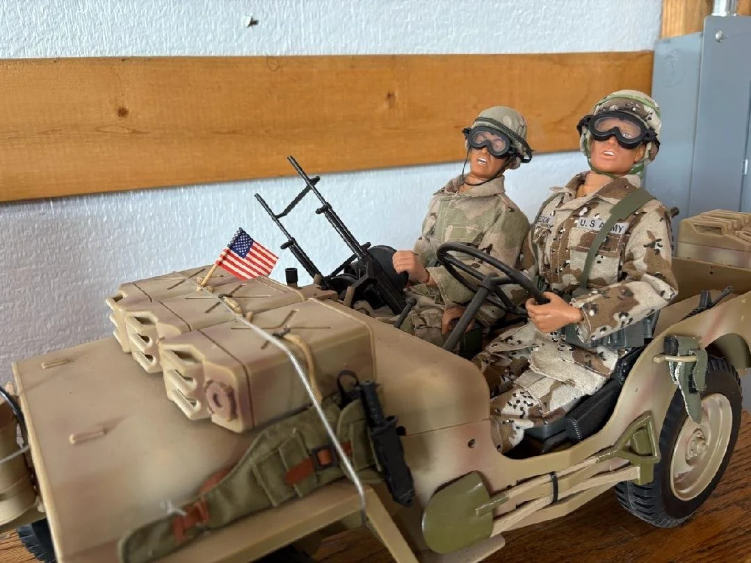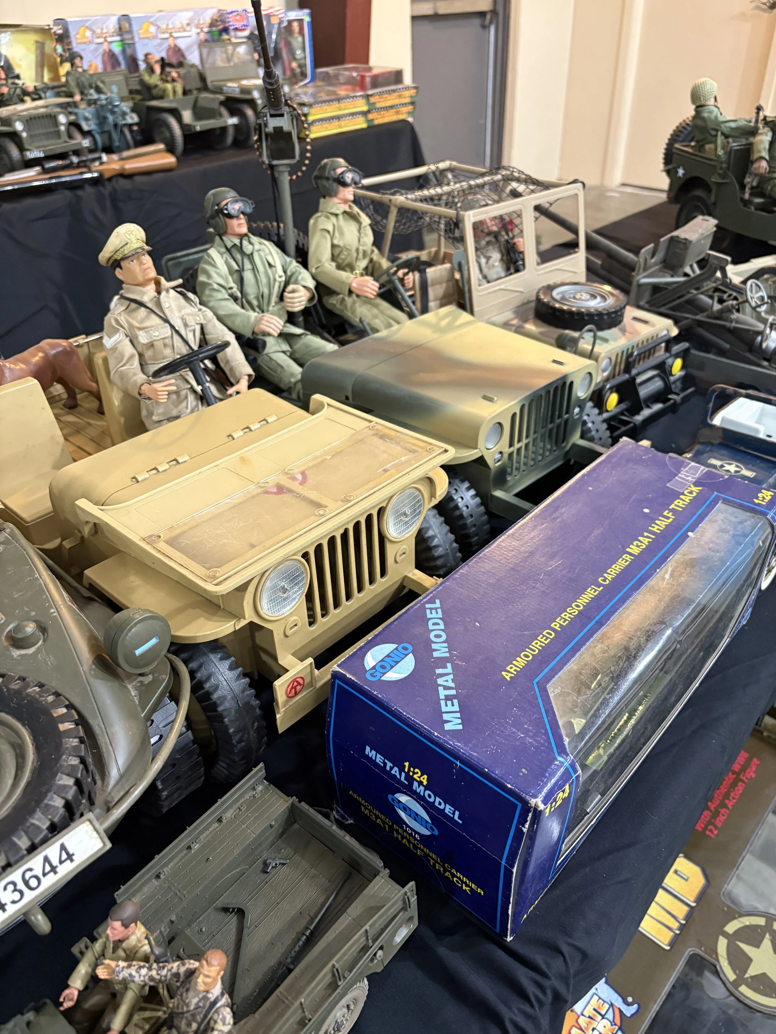 Large Collection of GI Joe Dolls, Jeeps, Tanks, Cannons & Toys Some Still Boxed. Helicopter Complete W/ Guns & Dolls, US Army Courier WLA 45 Harley Davidson NIB