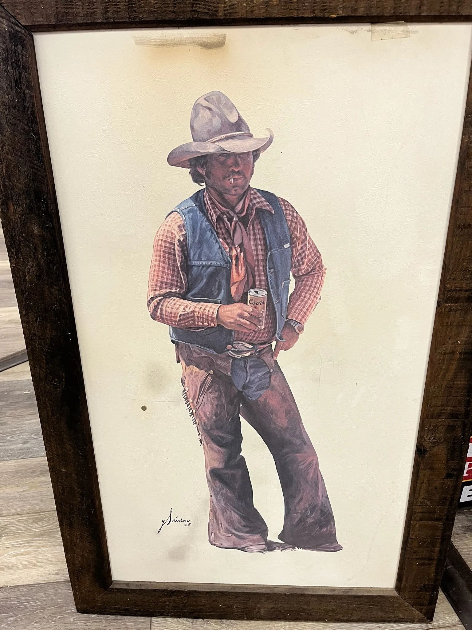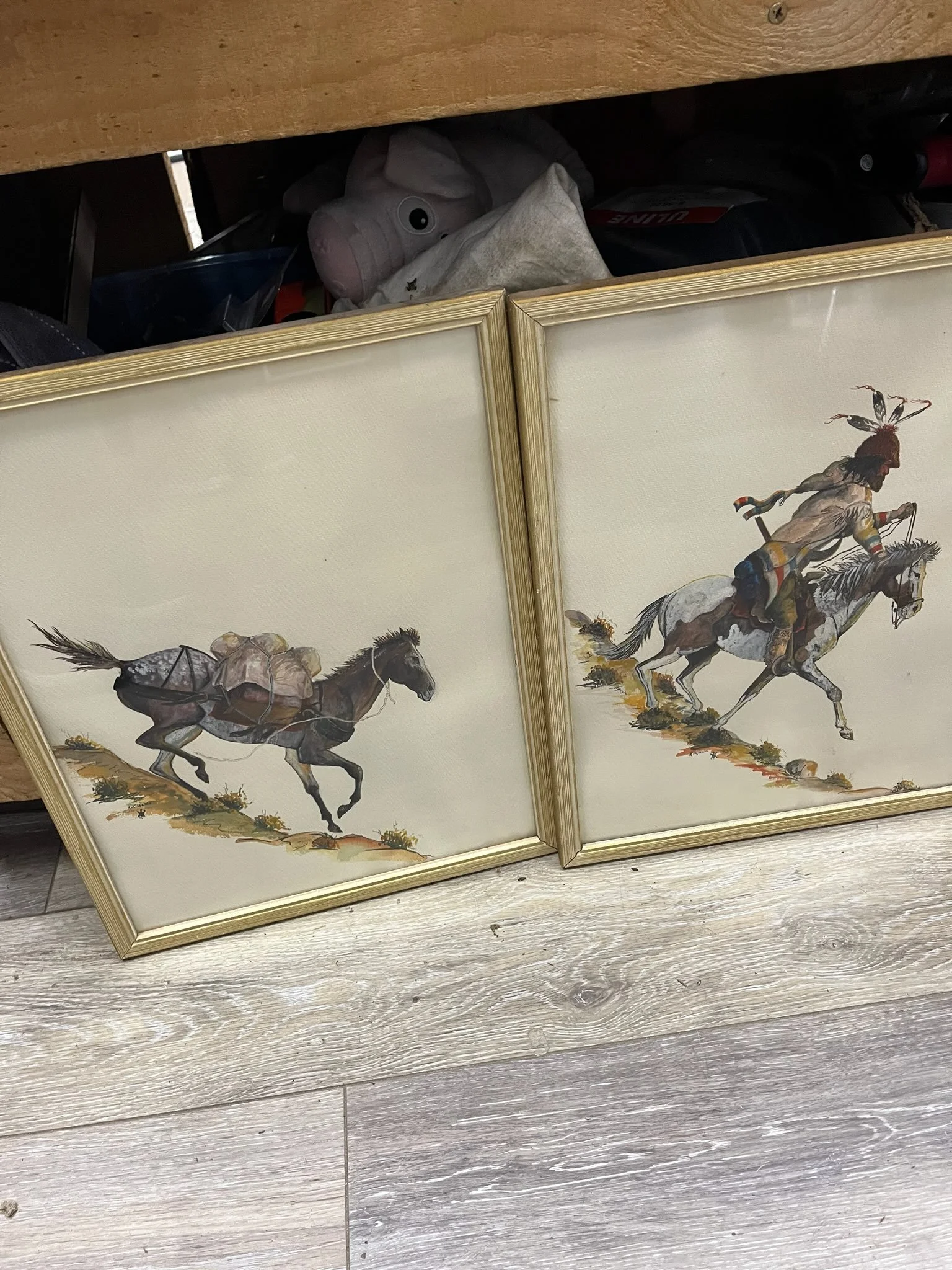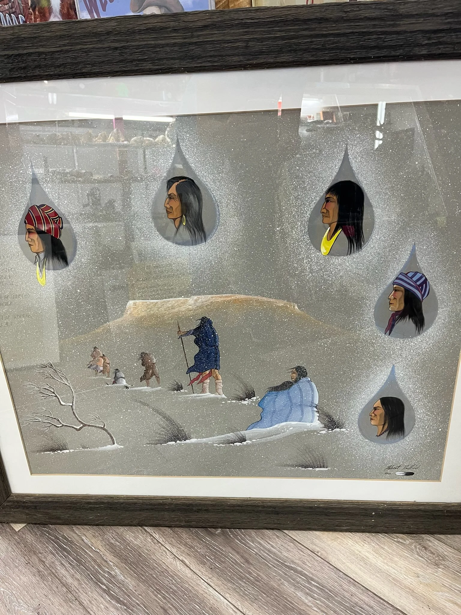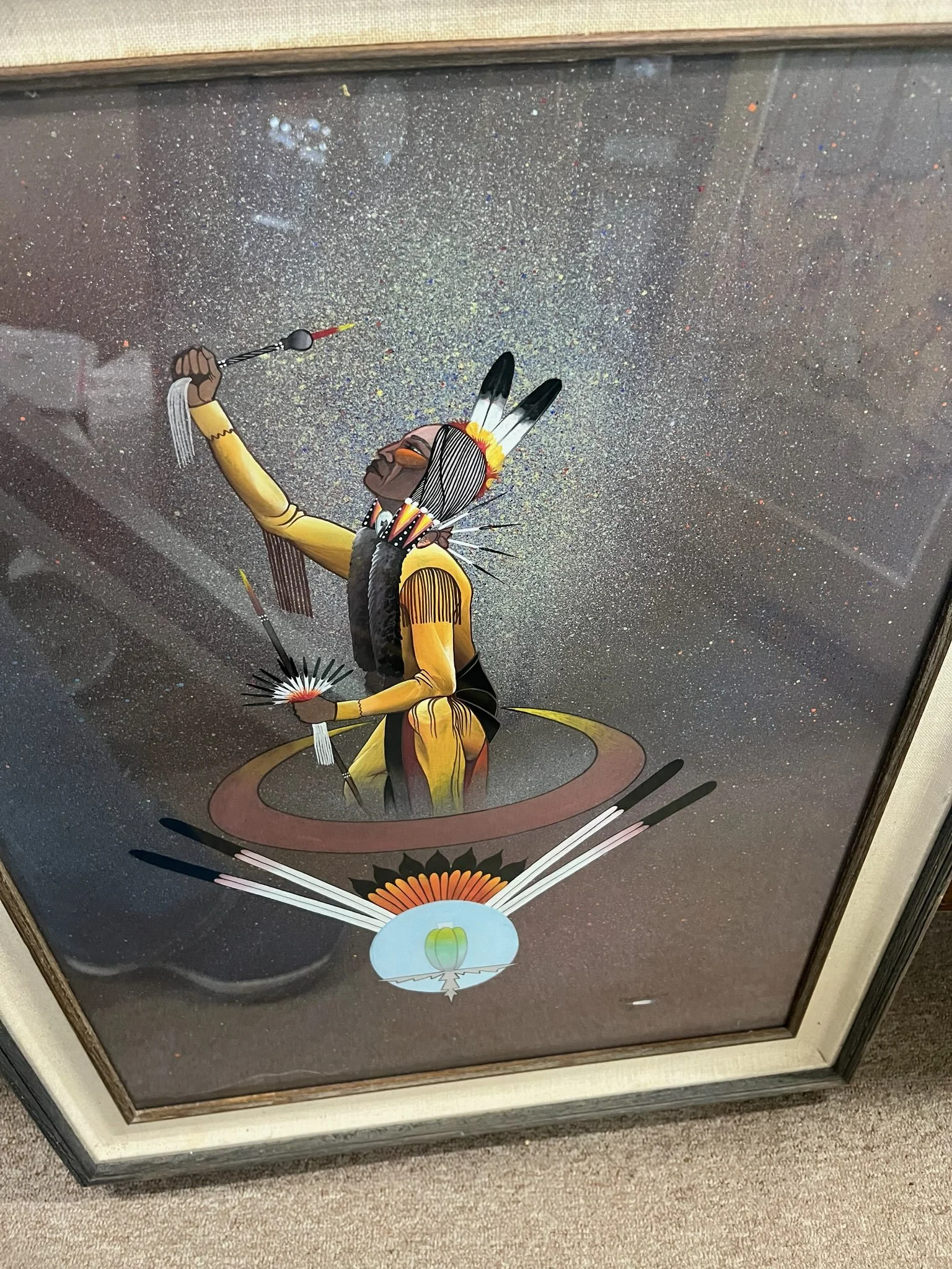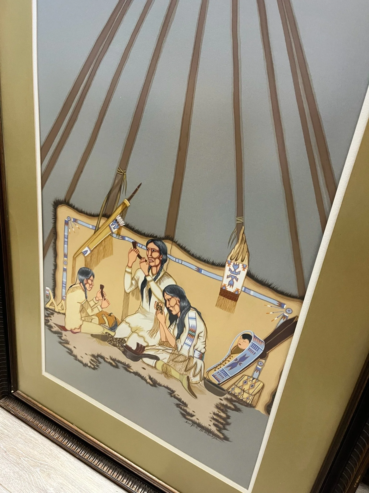 El Curtis “3 Chiefs Piegan” Walnut Framed 16.5"X11.5", Robert Chee Pair Of Prints Navajo Man & Woman, Jeri Oktalonli “Vision Quest” #280/1000 17”X20”, El Curtis “Waiting in the Forest Cheyenne” Plate #218 27” X 20”, El Curtis “Bear’s Belly” Arikara 18”X14”, Ozz Franco “Young Brave” #23/100 28”X20”, Ozz Franco “The Model” #1249/1500 24”X17”, Ozz Franco “Navajo Summer” #854/999 Artist Proof 24”X16”, Ozz Franco “Navajo Meditating” #1363/4000 24”X24”, Lin Ross Bixby “Eagle With Warrior” Original Oil/Acrylic 16”X20”, Lin Ross Bixby “Shadow Rider” Original Oil On Canvas 16”X12”, Orlinda Original Oil 3-D Paint On Canvas 15”X18”, “Maiden With Pottery” Print 13.5”X17.5”, Charles Russell “When The Land Belonged To God” Print 20”X32” (Purchased at Denver Art Museum Centennial 1989), Mark Powers “Covers The Land” 18.5”X15” 1999 Pencil Dakota Sioux, Richard Roberts #12/25 23”X17”, Armondo Pena 18.5”X16” Original?, Armondo Pena 22”X18” Print, Armondo Pena 18”X14” Print, Armondo Pena “Danzantes 3” 5”X7”, Indian Chief Oil On Canvas 20”X16”, Pau-Law-Taine Oil On Board 12”X16”, Squaw w/ Shawl 11”X7” Small 1982, Sandra Stemmler “Sky City” Acoma 1990 9”X7.5”, Sandra Stemmler “Blankets” Unframed Print 9.5”X7”, Sandra Stemmler “Last Day of Summer” #43/250, Mary Frasher-Brown “3 Bears” 15”X19.5”, Wilkes “Eagle Princess” Pencil 15”X12”, Wilkes “He Went With The Buffalo” Pencil 15”X 12” Kenai Ak, Joanie Barbier “Mothering” 16”X21”, Sandra Santara “He Who Flies With Ravens” #302/500 11”X16”, Painted Skull, Sand Paintings, “Morning Light” Landscape Original Oil Painting, Original Signed Paintings by Hood, Aquasu, Johnny Secatero, Gary White, Doc Tate, Nevaquaya, RV Greeves, Black Owl, Robert Redbird, 2 Snidow Coors Prints, Back “Bev Doolittle Print “Double