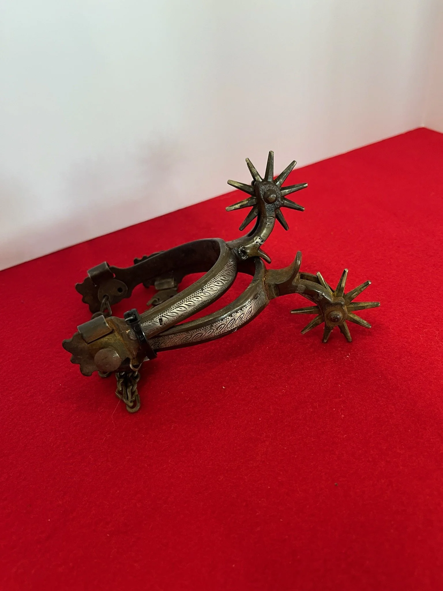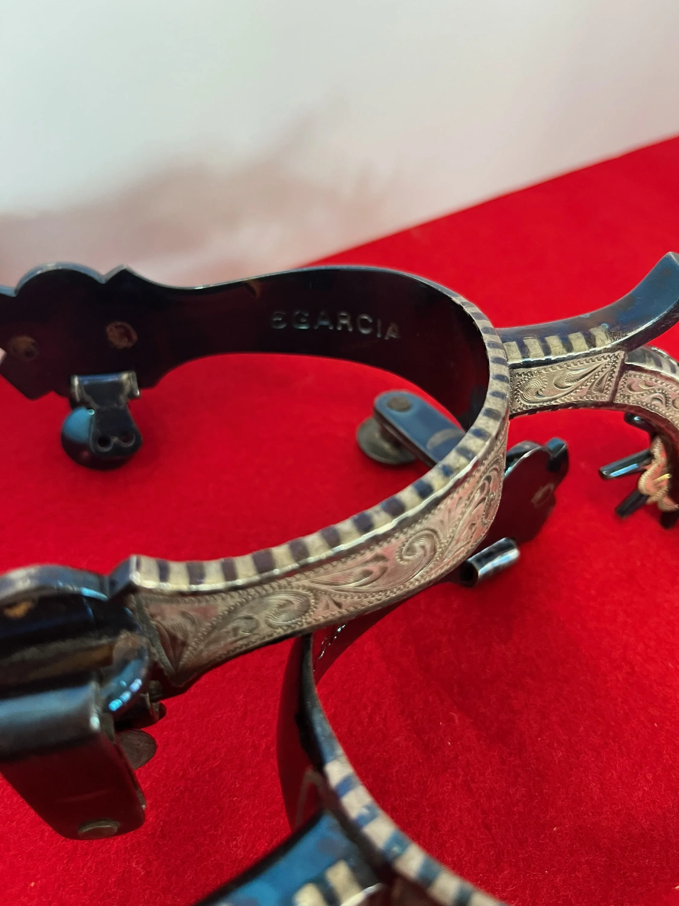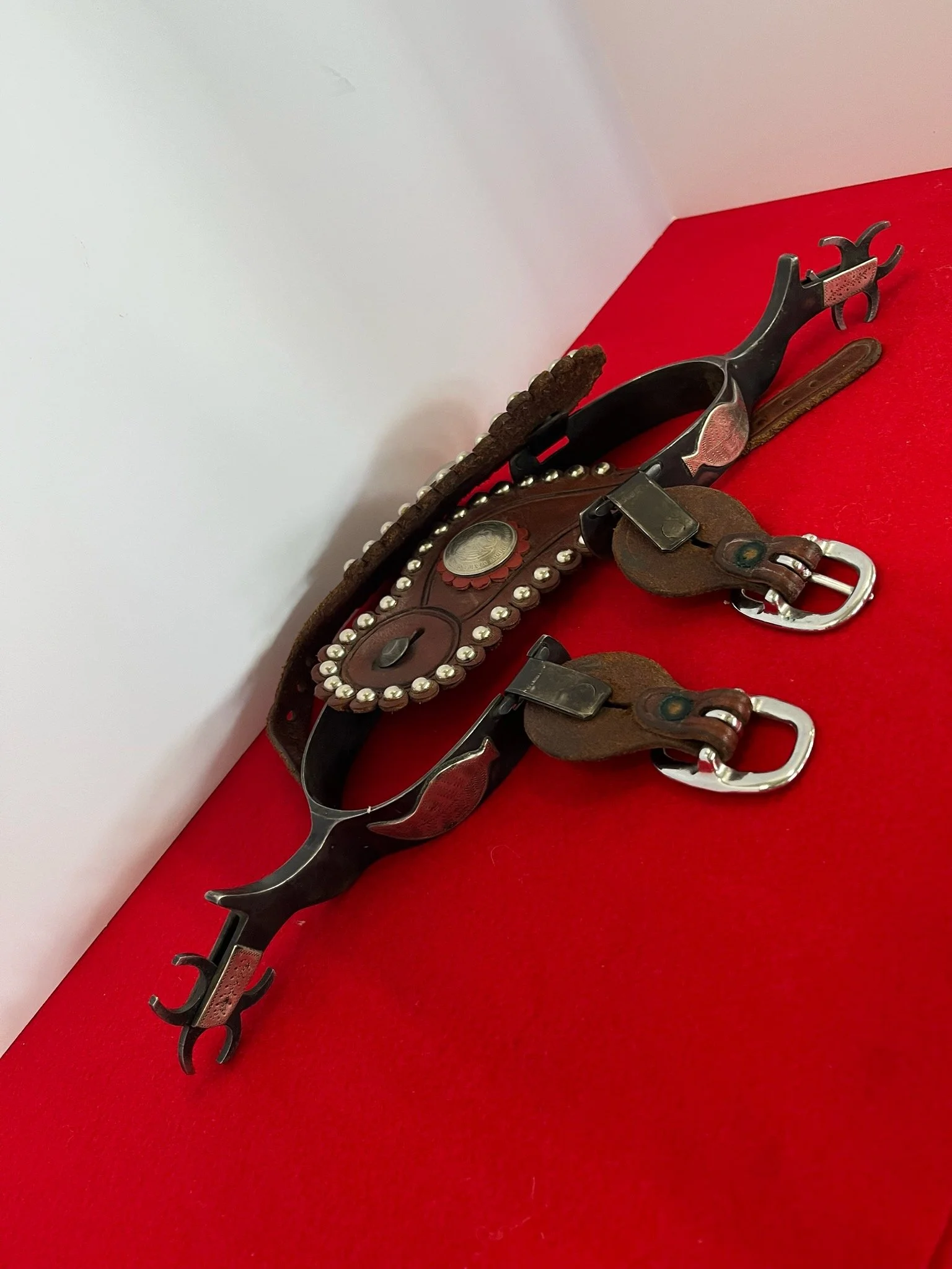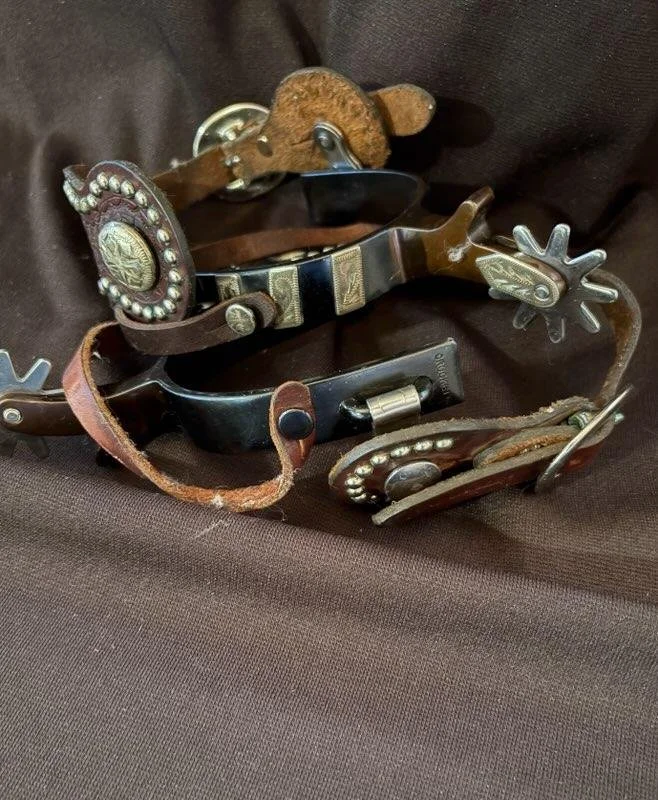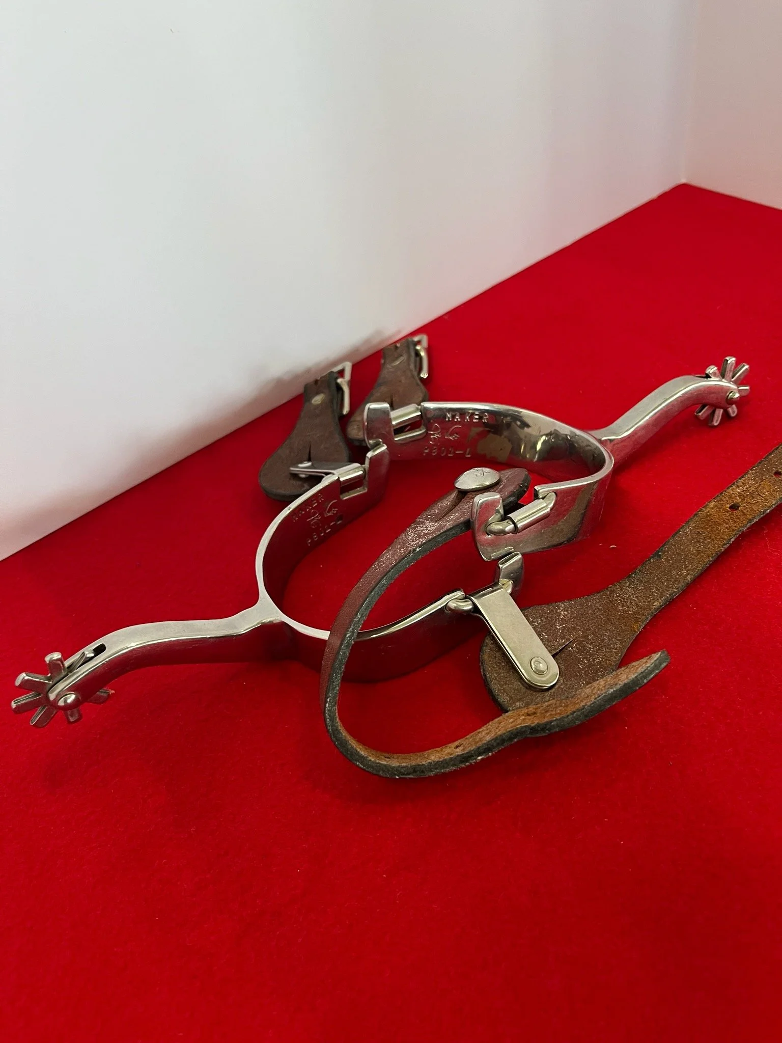 Crockett Renalde w/ Locking Rowels (Never Worn), GS Garcia, E Garcia, Vogt, Horsehead, Crockett, Silver Inlaid Crockett w/ Tooled Straps, Kelly Inlaid, Kelly Bros., Crockett Stainless, Crockett w/ Heiser Straps, Cavalry, Black Iron Inlaid Imports, Assorted Straps of Spur Rowels, Auggie Bjorklun Hand Made Spur Straps, Spur Racks, Carpeted Display Spur Racks, Partrade Rowel Cardboard Store Display Card