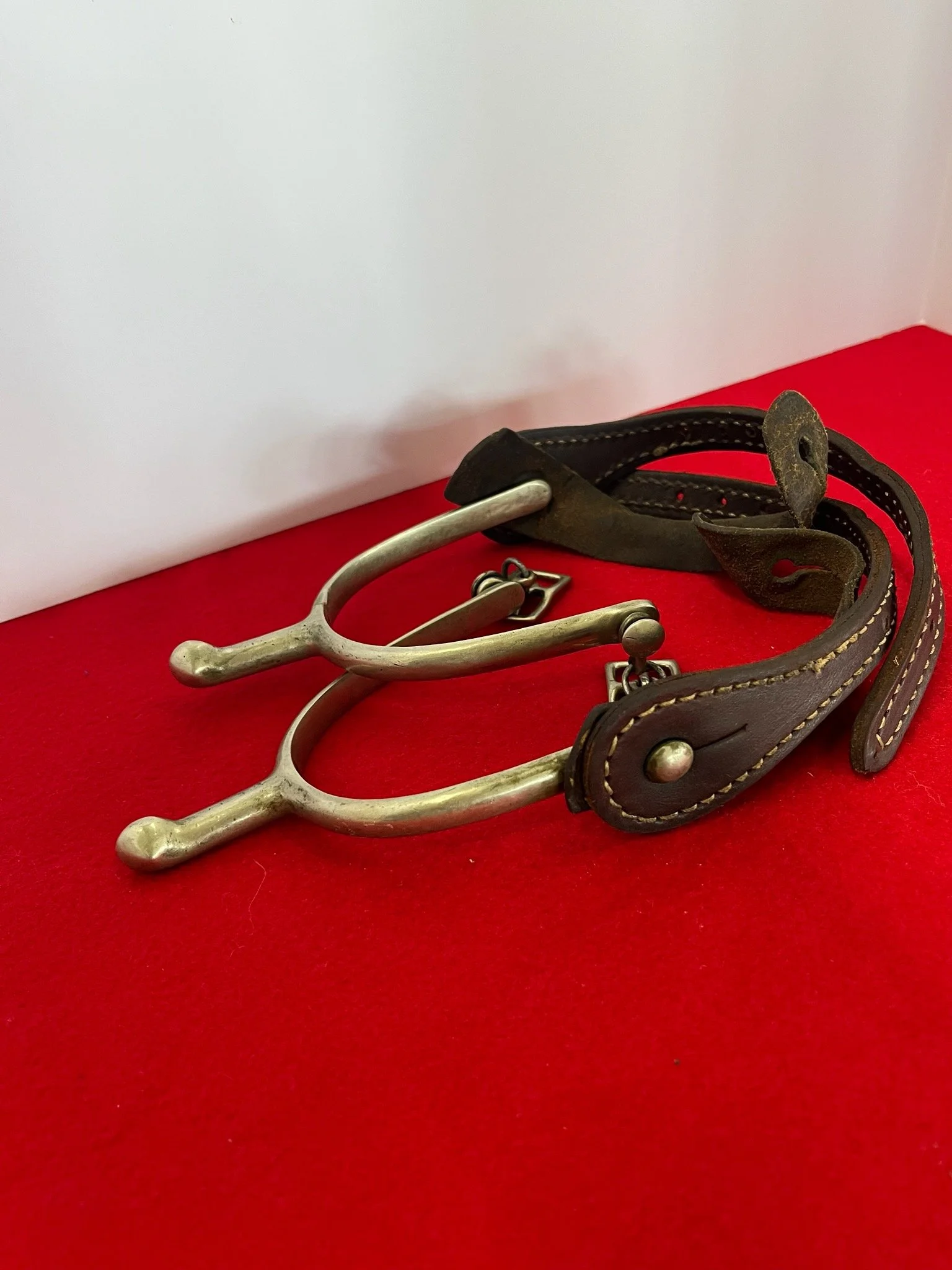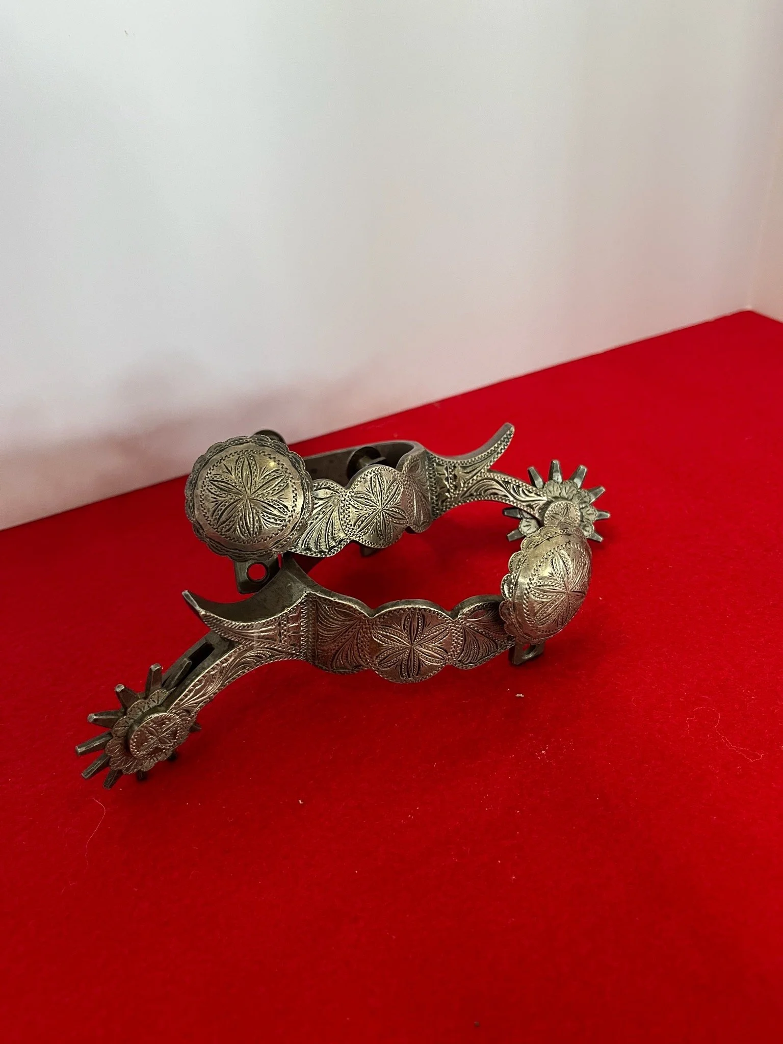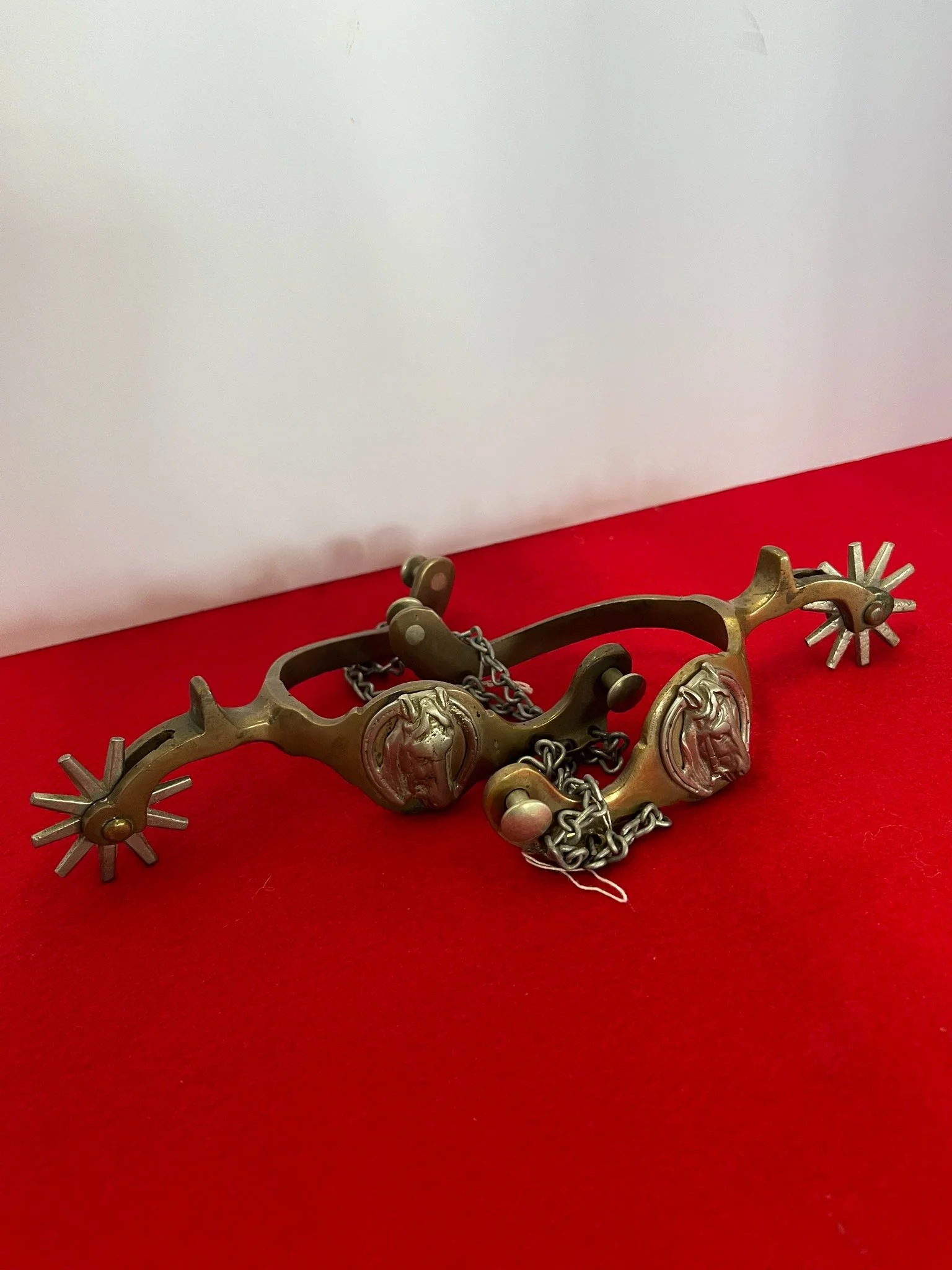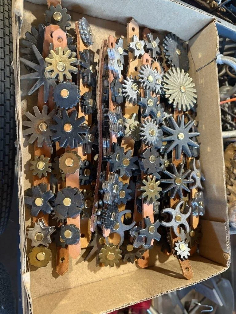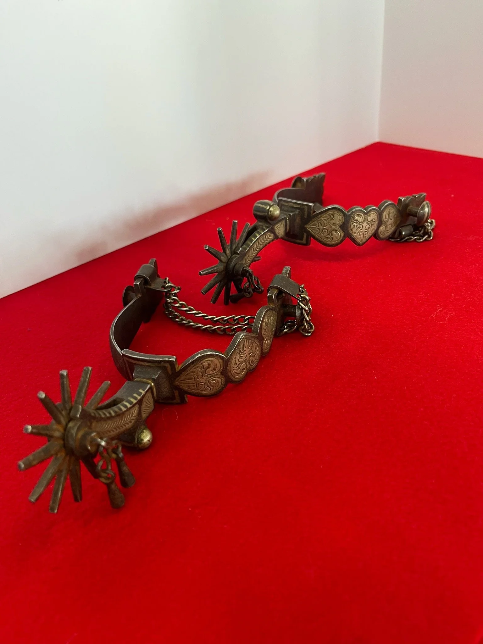 Crockett Renalde w/ Locking Rowels (Never Worn), GS Garcia, E Garcia, Vogt, Horsehead, Crockett, Silver Inlaid Crockett w/ Tooled Straps, Kelly Inlaid, Kelly Bros., Crockett Stainless, Crockett w/ Heiser Straps, Cavalry, Black Iron Inlaid Imports, Assorted Straps of Spur Rowels, Auggie Bjorklun Hand Made Spur Straps, Spur Racks, Carpeted Display Spur Racks, Partrade Rowel Cardboard Store Display Card