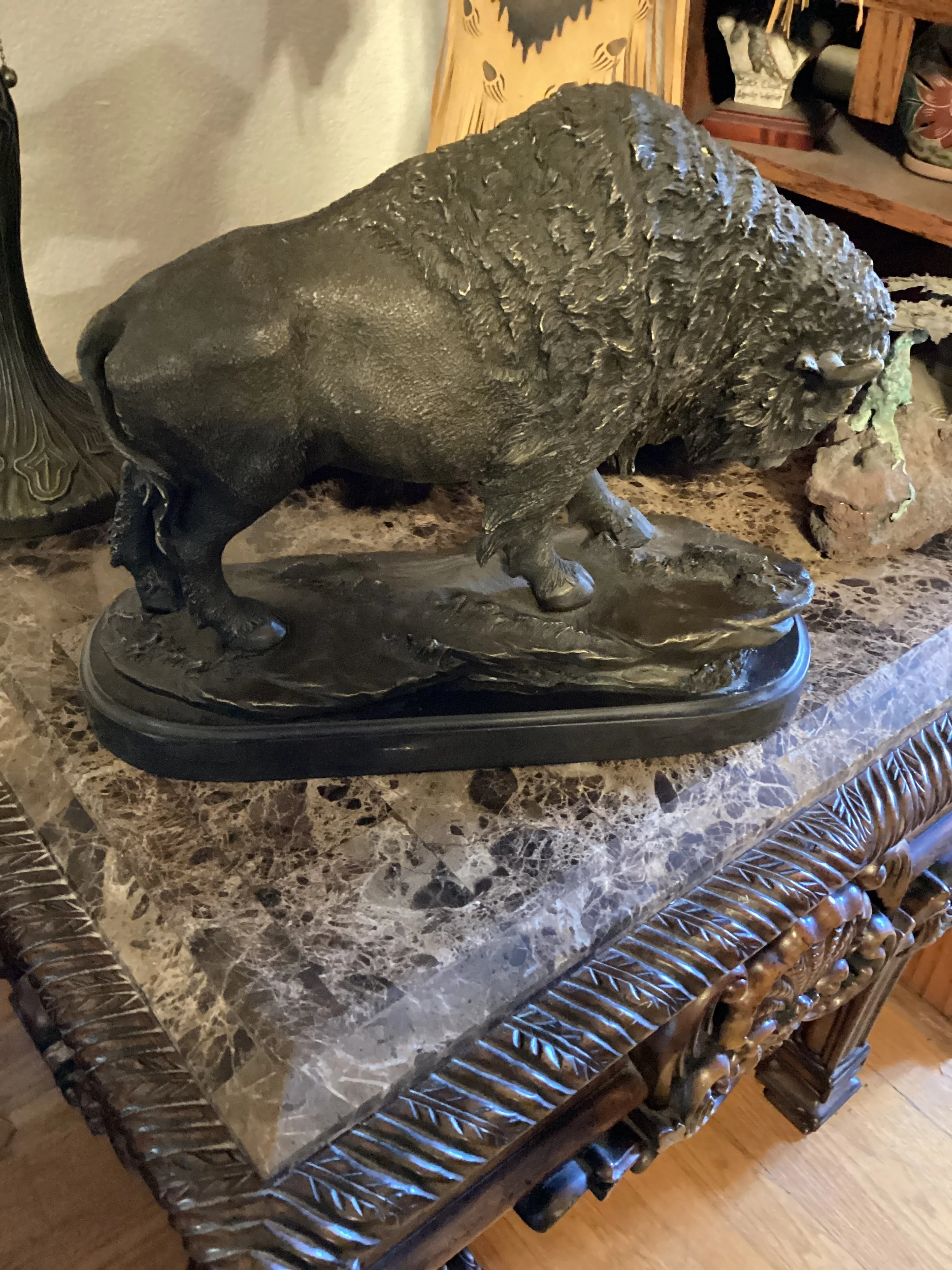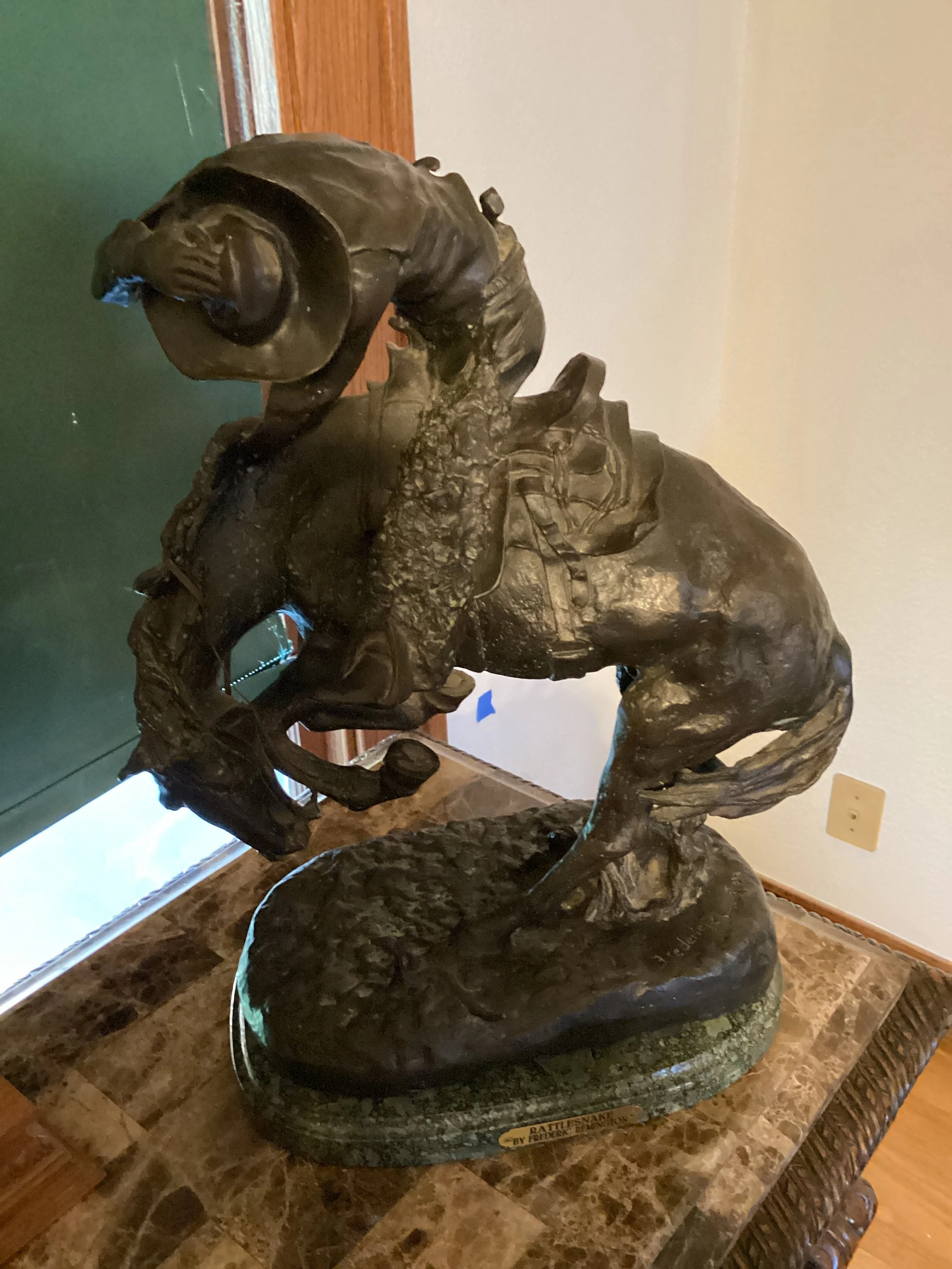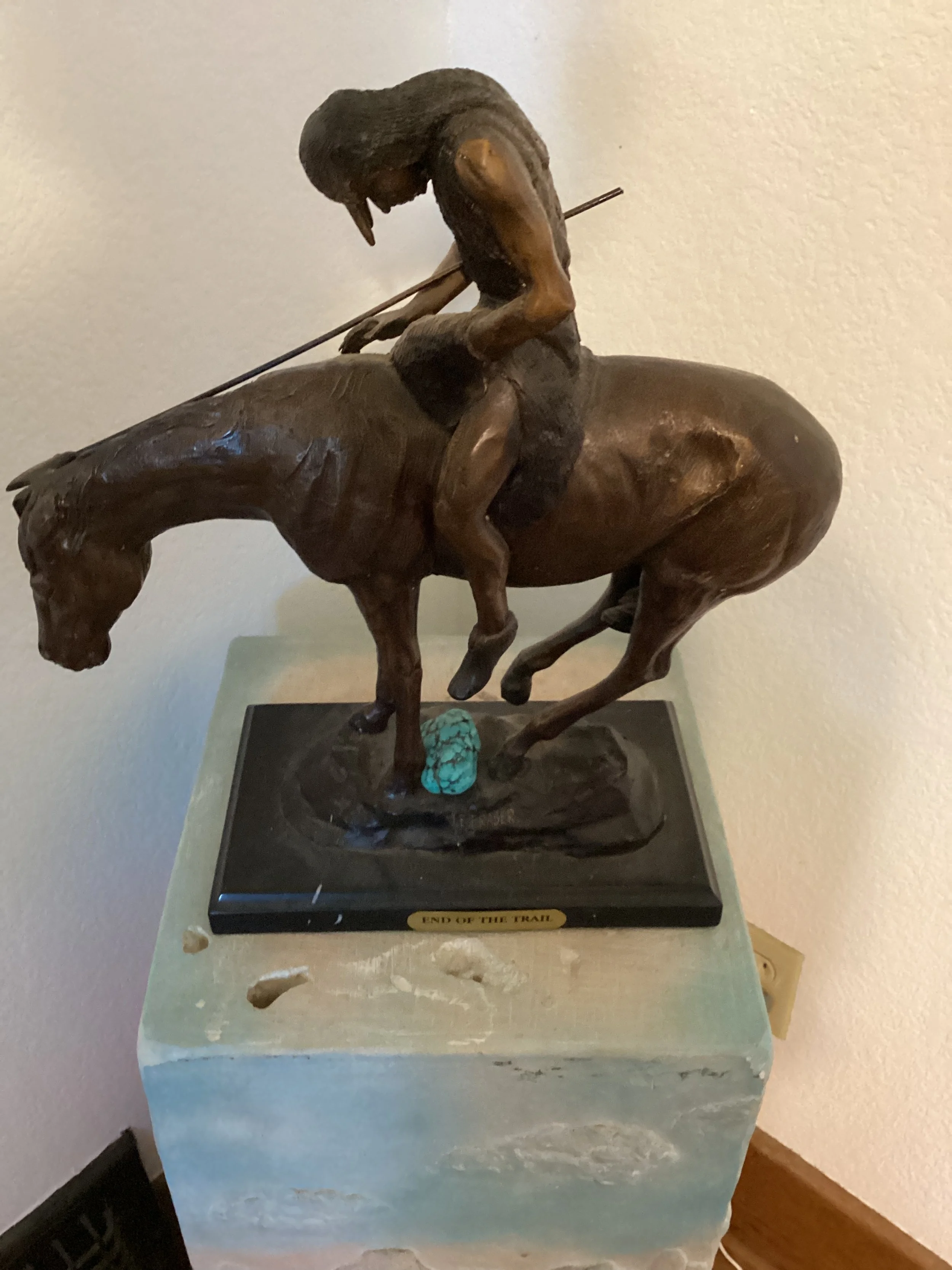 RF Murphy Bronze “Spirit of the Blackbird”, Riley Manning #4 1982 52# Alabaster?, Mother & Child Sculpture 24”X7”, Wood Carved Indian 16”, Face Statue 10.5”X3.5”, Warrior W/ Spear Bronze 27” Tall, Bronze Buffalo 13.5”X10.5”, Remington “Rattlesnake” Bronze 20.5”X13.5”, Carved Soap Stone Maiden 10”, Jewels Begay Sculpture 9.5”X9”, End Of Trail Bronze 14”X7”