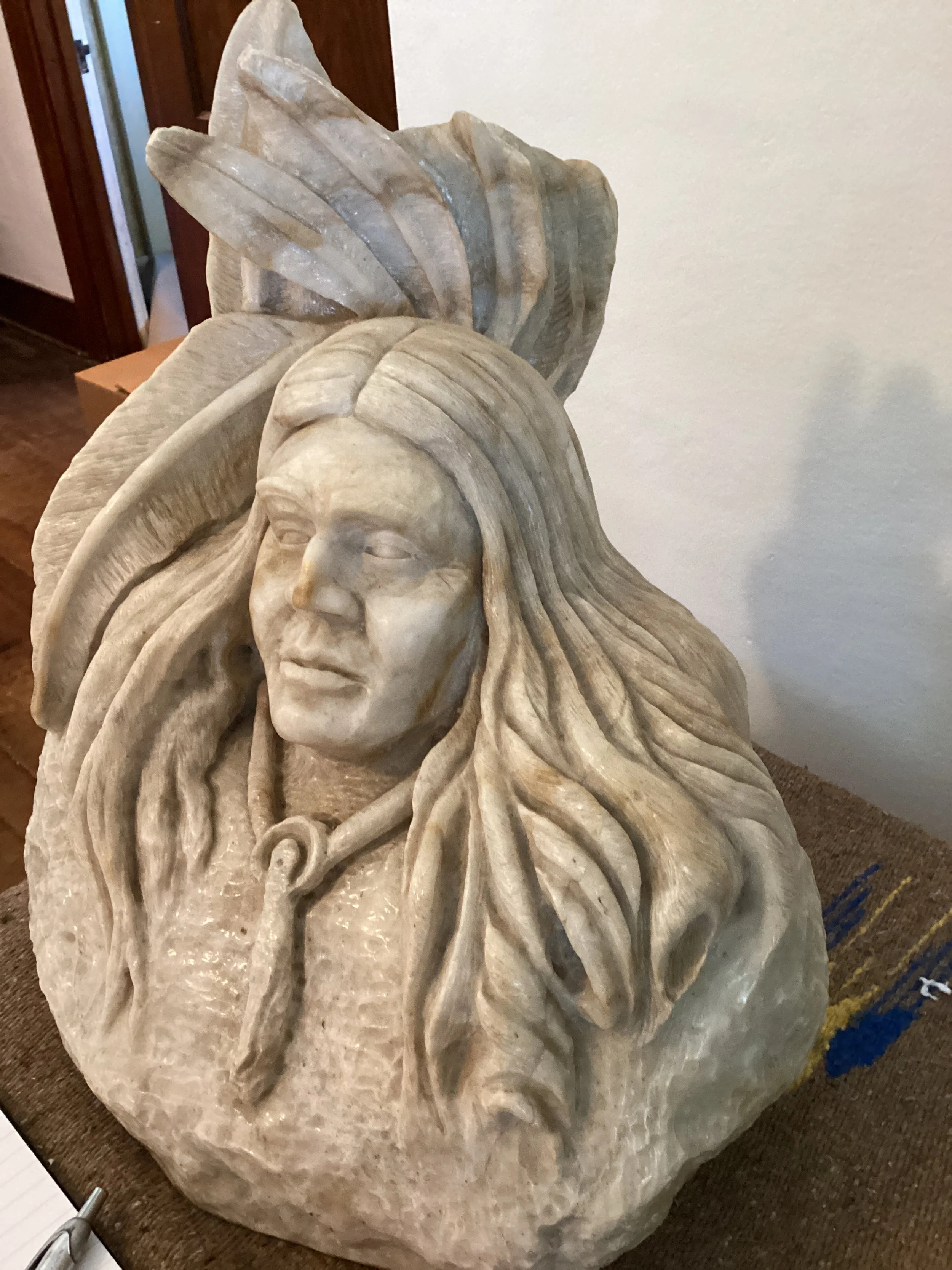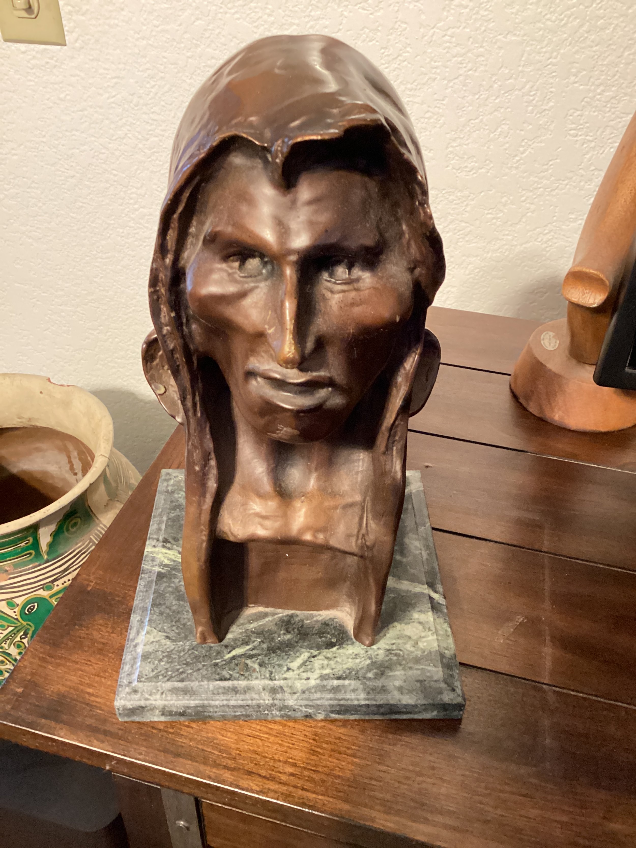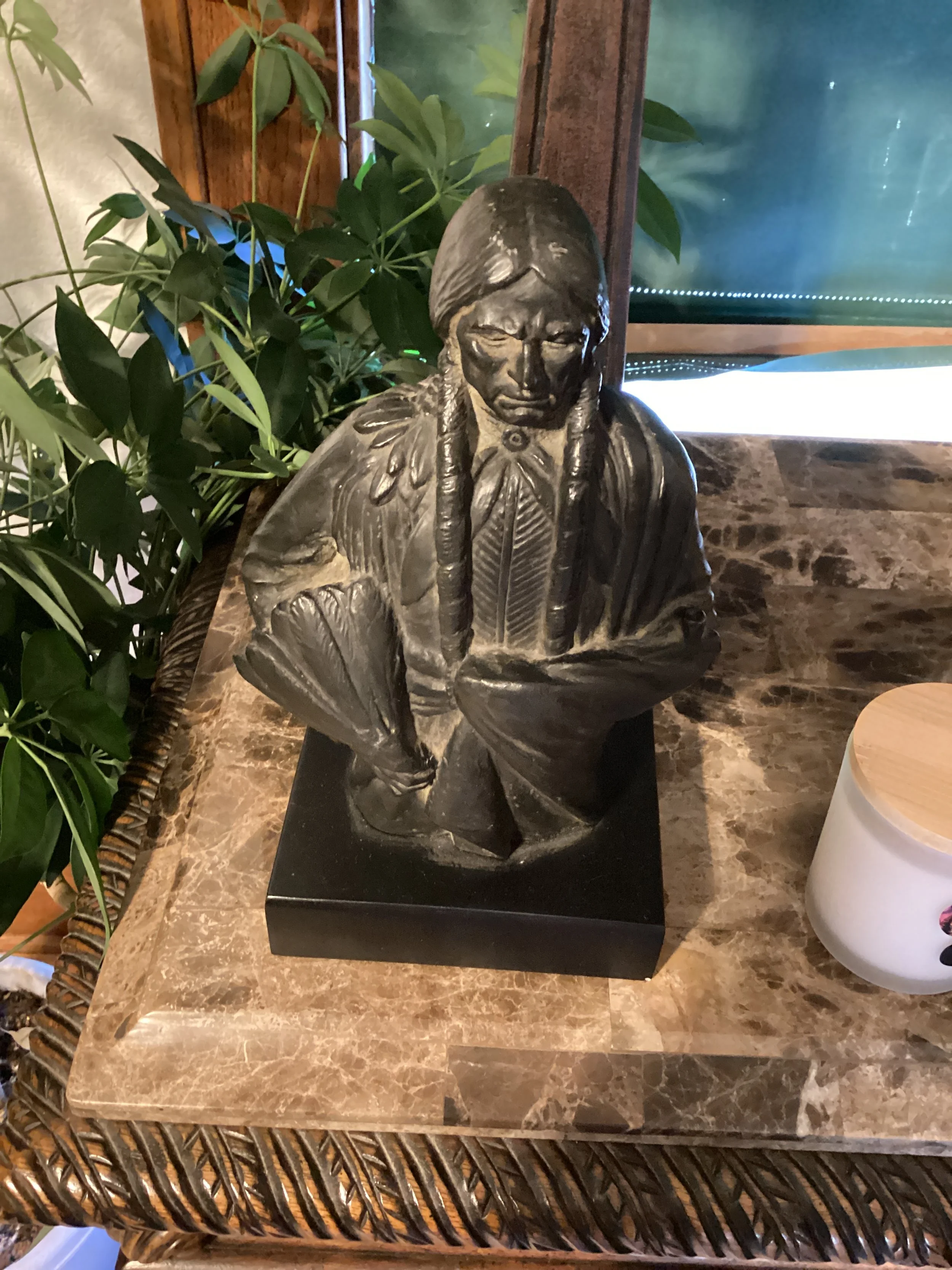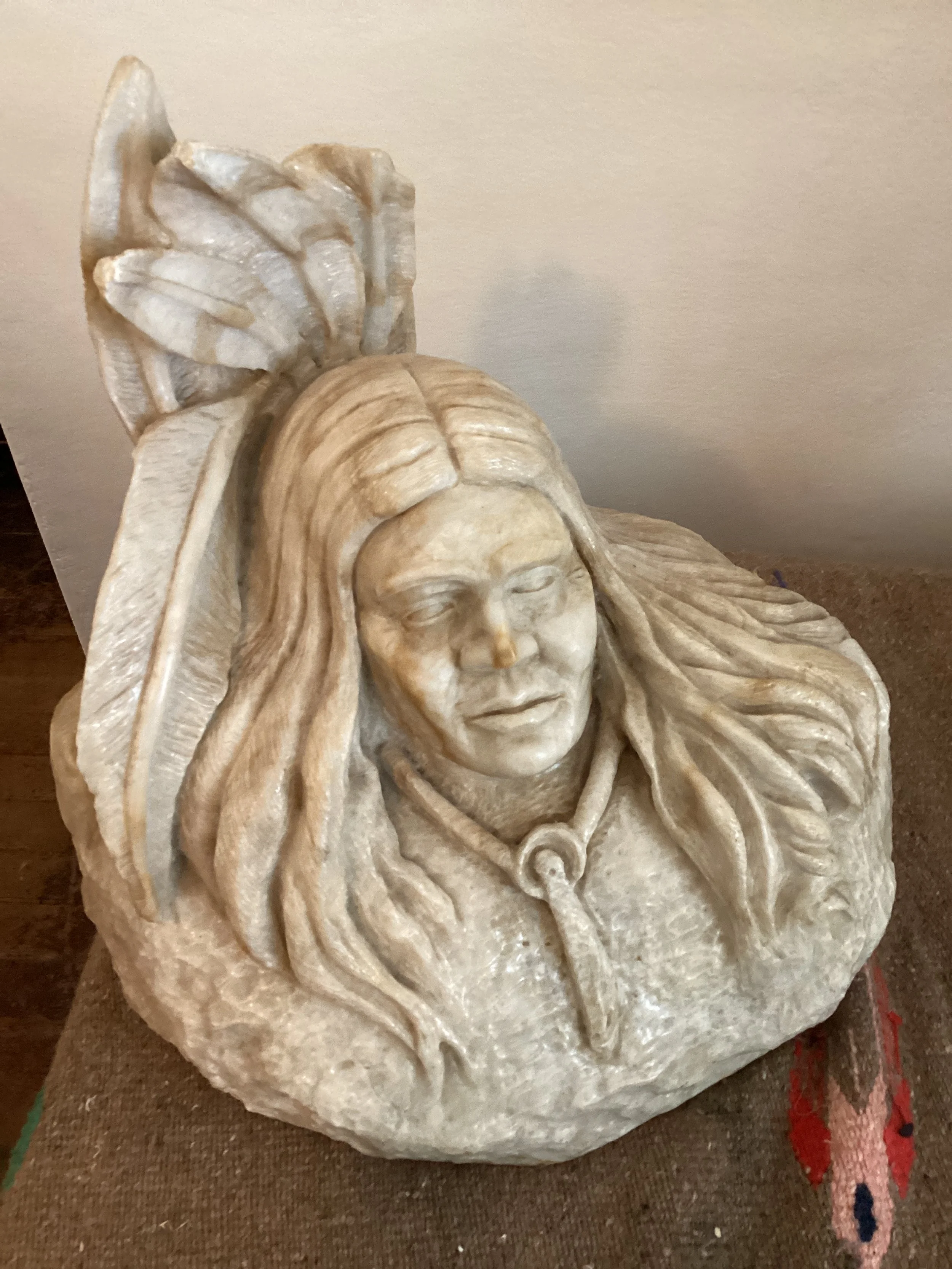 RF Murphy Bronze “Spirit of the Blackbird”, Riley Manning #4 1982 52# Alabaster?, Mother & Child Sculpture 24”X7”, Wood Carved Indian 16”, Face Statue 10.5”X3.5”, Warrior W/ Spear Bronze 27” Tall, Bronze Buffalo 13.5”X10.5”, Remington “Rattlesnake” Bronze 20.5”X13.5”, Carved Soap Stone Maiden 10”, Jewels Begay Sculpture 9.5”X9”, End Of Trail Bronze 14”X7”